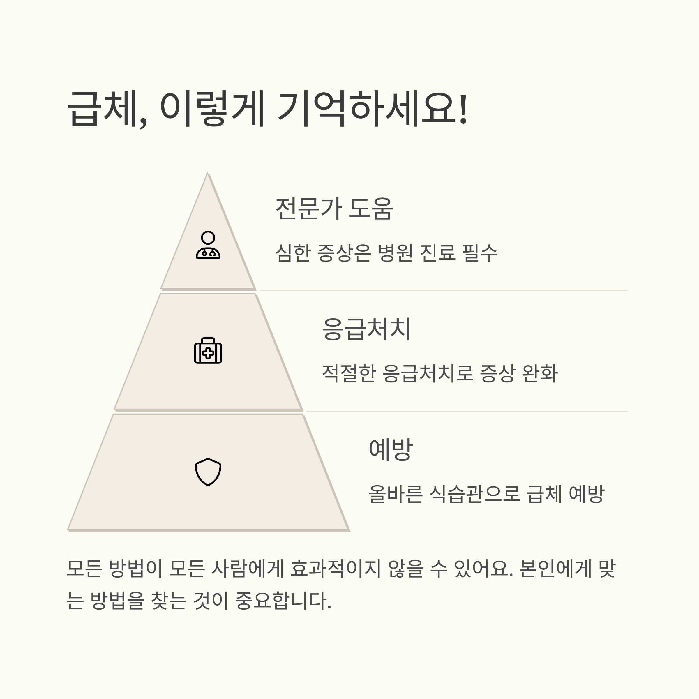급체 응급 처치 방법들을 살펴보았습니다. 이 방법들은 급체 증상을 완화하는 데 도움을 줄 수 있지만, 모든 사람에게 효과가 있는 것은 아니고 증상이 심하거나 오래 지속된다면 반드시 병원을 찾아 전문적인 진료를 받아야 합니다. 본인에게 맞는 방법을 찾아 건강을 챙기는 것을 잊지 마세요. 건강한 삶을 위해 우리 모두 노력해봐요!