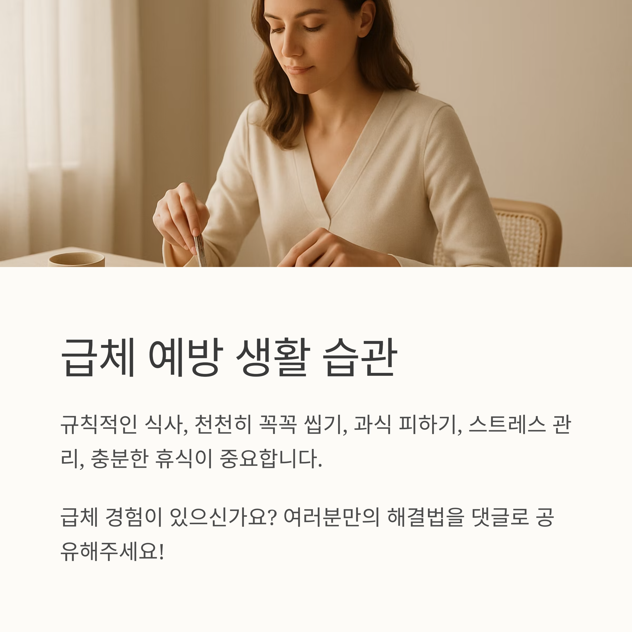 저는 규칙적인 운동을 통해 스트레스를 해소하고 건강한 생활 습관을 유지하고 있습니다. 규칙적인 생활 패턴을 유지하고, 스트레스를 관리하고, 충분한 수면을 취하는 것은 급체 예방에 큰 도움이 됩니다. 건강한 식단과 생활 습관을 유지하는 것이 급체뿐 아니라 다른 건강 문제 예방에도 도움이 된다는 사실 잊지 마세요.