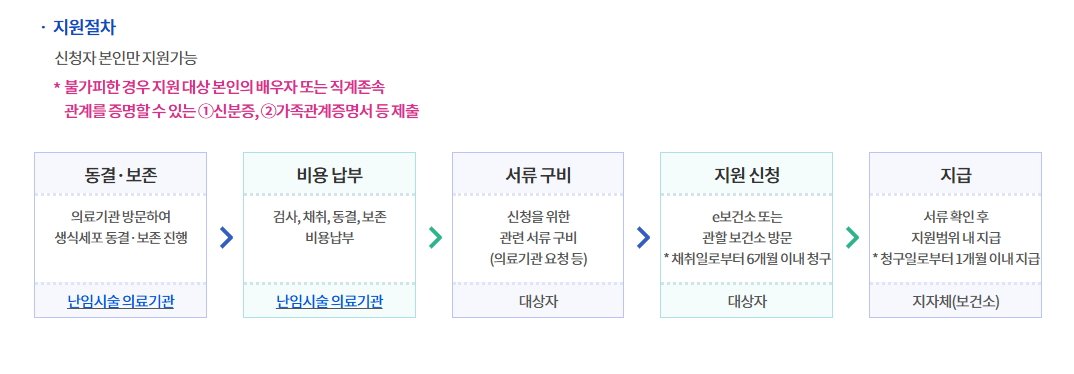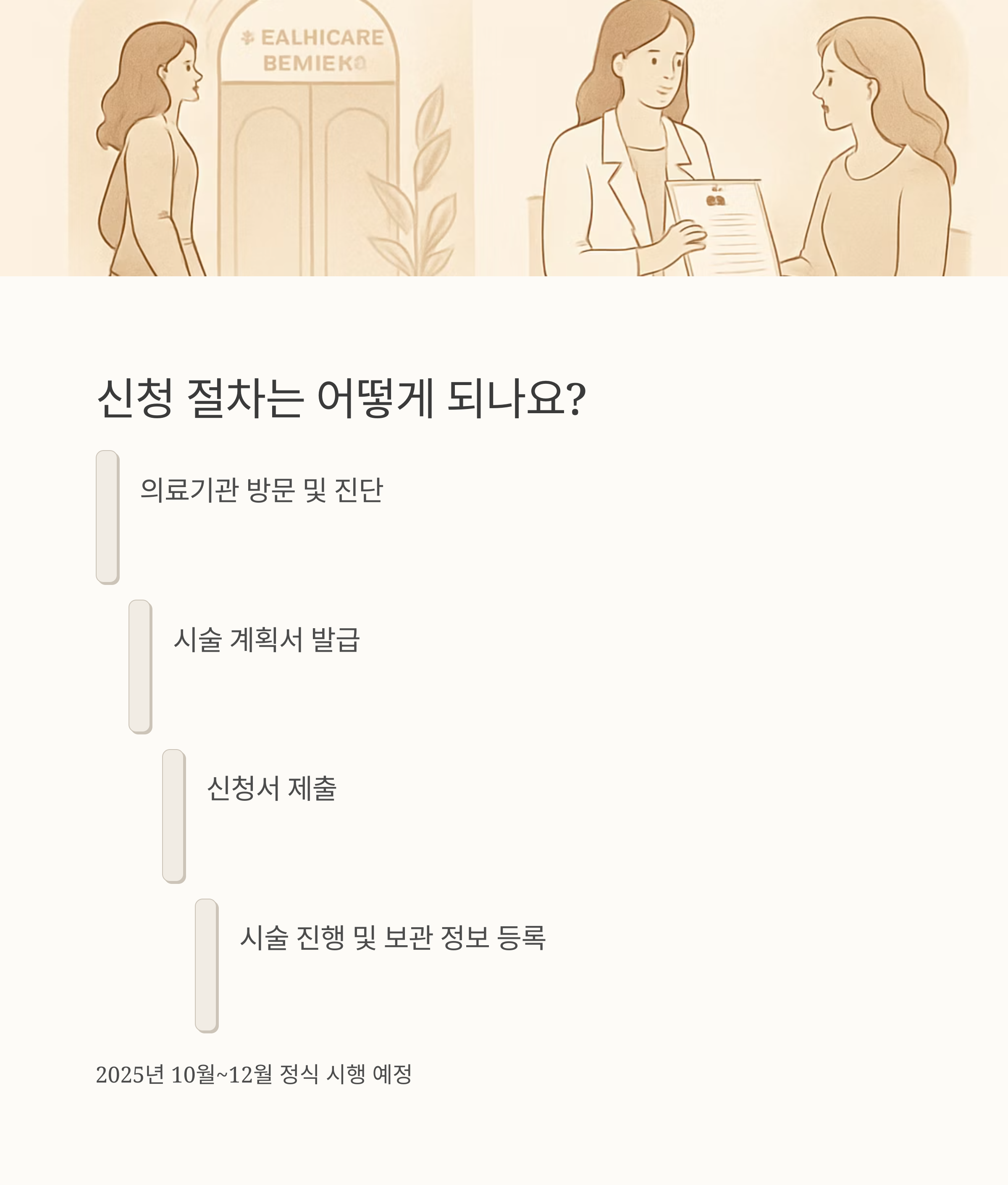 지원 대상자로 선정되면 시술이 진행되고, 냉동 보관 정보를 등록하는 것으로 모든 절차가 마무리됩니다. 현재는 시범 사업 단계이므로, 자세한 내용은 하반기(2025년 10월~12월) 정식 시행 이후에 주소지 관할 보건소나 e보건소 웹사이트를 통해 확인하시는 것이 가장 정확합니다.