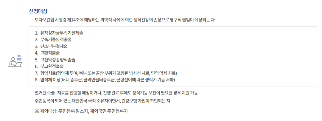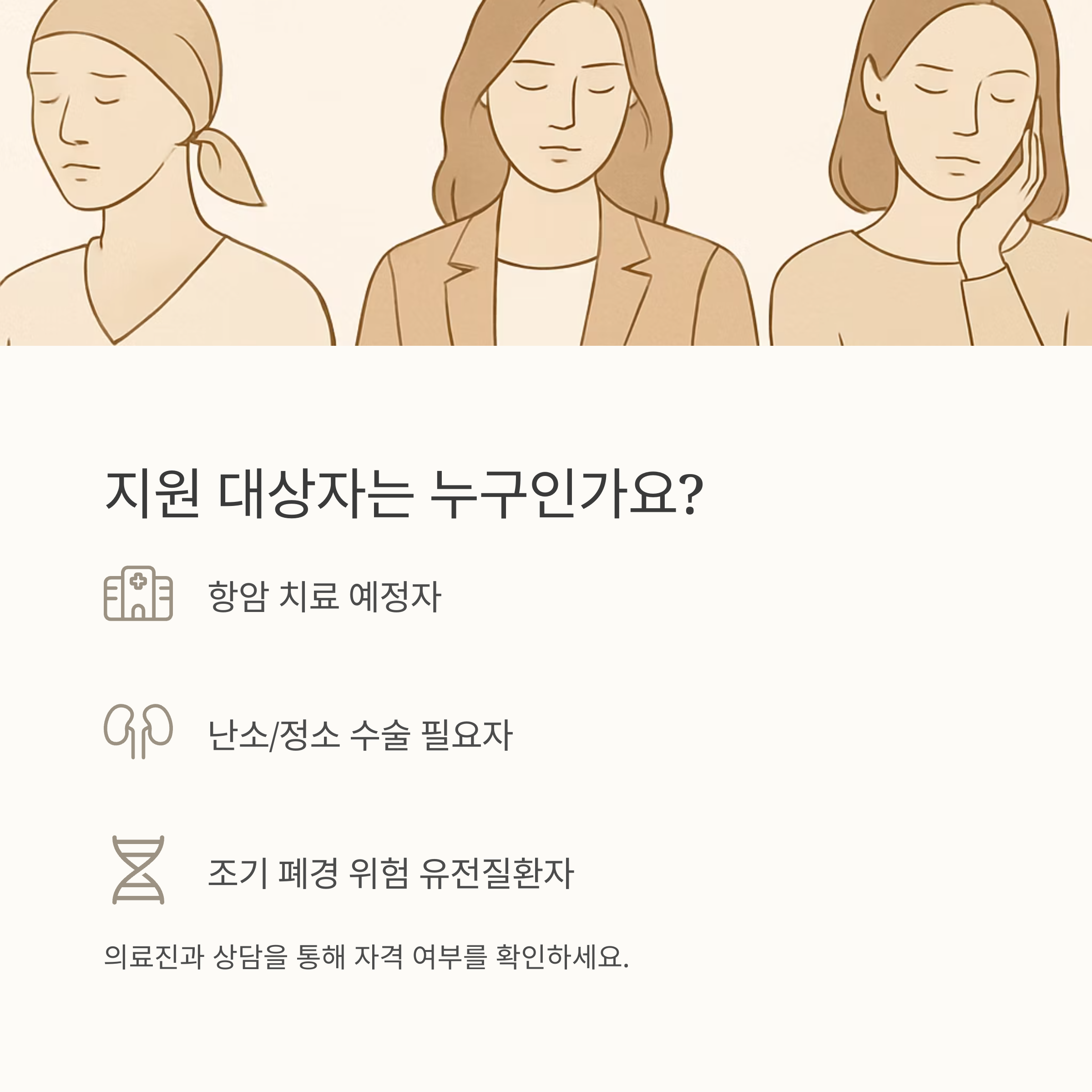 난자 정자 냉동 비용 지원 사업은 누구에게나 적용되는 것은 아닙니다. 의학적으로 영구 불임이 우려되는 분들께 집중 지원됩니다. 항암 치료를 앞두고 계신 분, 난소나 정소 수술을 해야 하는 분, 조기 폐경 위험이 있는 유전 질환을 앓고 계신 분 등이 주요 대상입니다.
