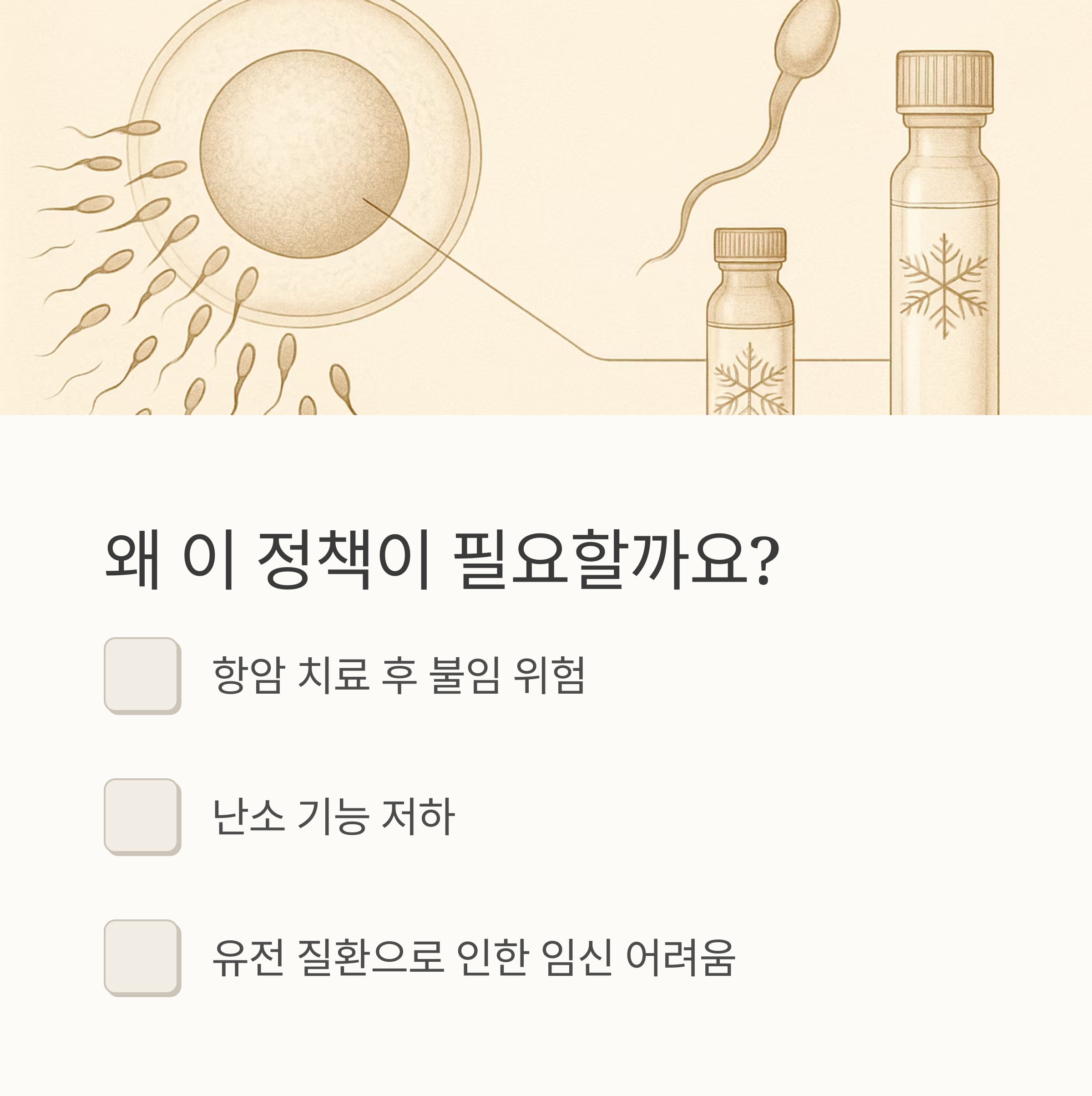 안녕하세요. 뜻밖의 질병이나 상황으로 힘든 시간을 보내고 계신 분들께 작은 희망을 드리고자 이 글을 작성했습니다. 2025년부터 시행되는 정부의 난자·정자 냉동 지원 정책에 대해 자세히 알려드리겠습니다. 꼼꼼히 읽어보시고, 혹시라도 도움이 필요하신 분들에게 이 소중한 정보를 전달해주세요.