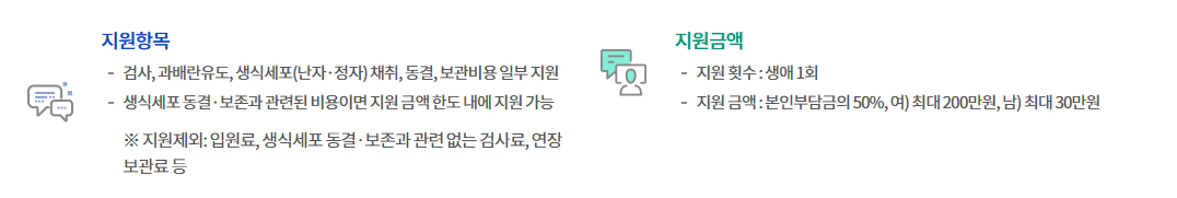 정부 지원의 핵심은 난자나 정자를 채취하고 냉동 보관하는 데 드는 비용입니다. 구체적으로 난자 냉동의 경우 채취 시술, 마취, 그리고 최초 6개월간의 냉동 보관 비용이 지원됩니다. 정자 냉동 역시 채취와 처리, 냉동 비용이 포함됩니다.