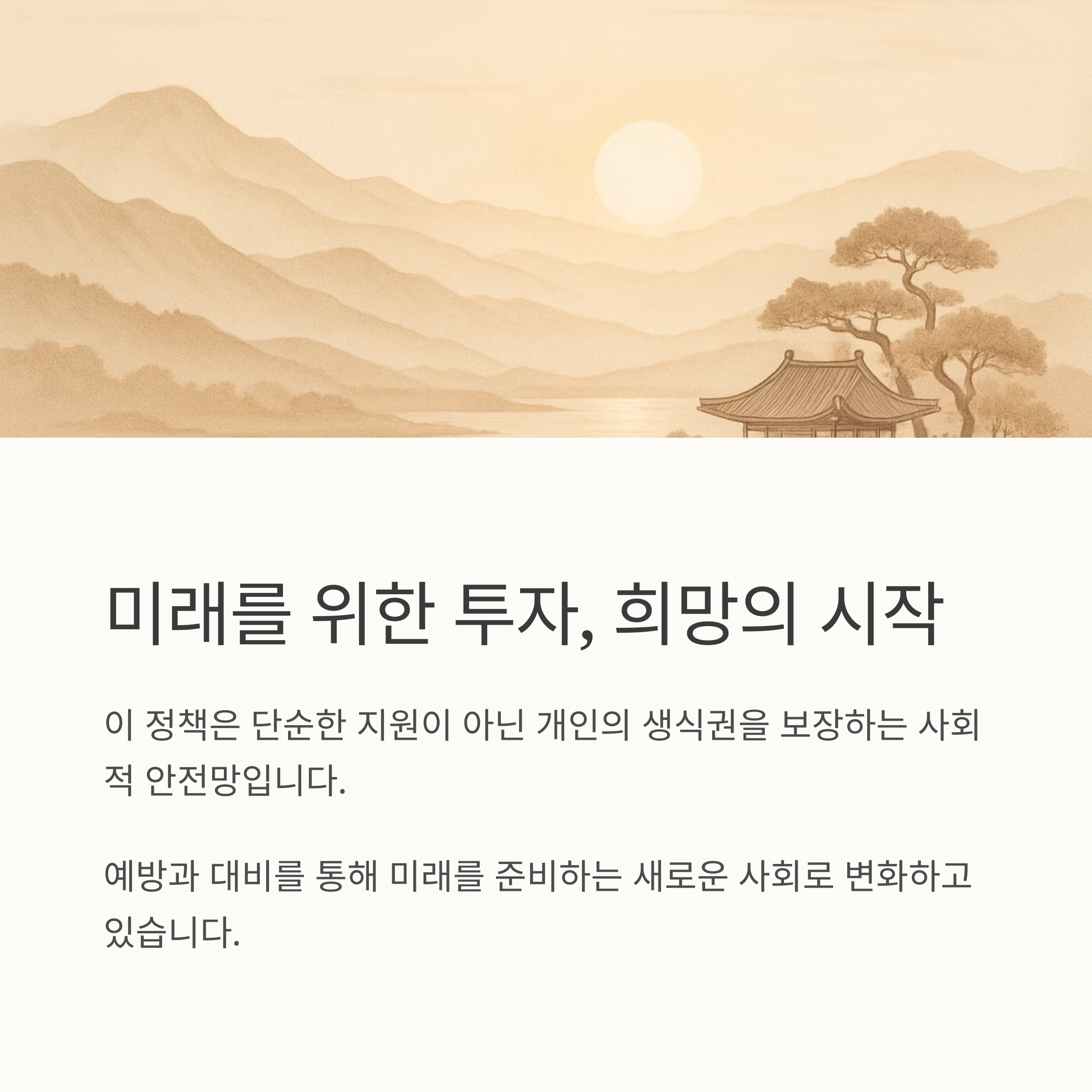 하지만 이제는 달라졌습니다. 2025년부터 국가가 '미래의 나'를 위한 준비를 지원해주기 시작했습니다. 더 이상 혼자 힘들어하지 마세요. 국가가 함께합니다. 이 정책은 단순한 지원책이 아니라, 소중한 꿈을 지켜주는 든든한 버팀목이 될 것입니다. 이 정책이 왜 필요한지, 얼마나 중요한지를 여러분과 함께 공유하고 싶습니다. 희망을 잃지 마세요. 여러분은 혼자가 아닙니다.