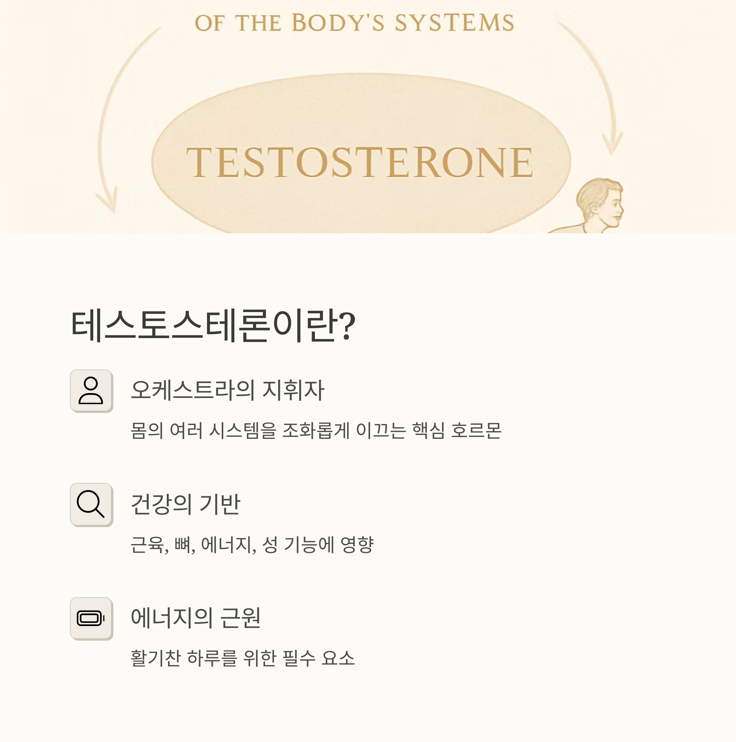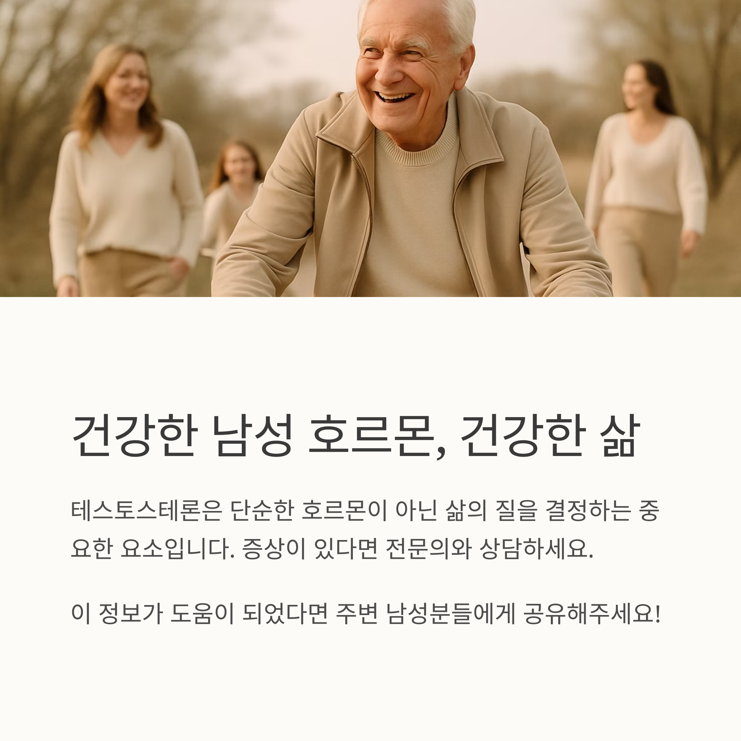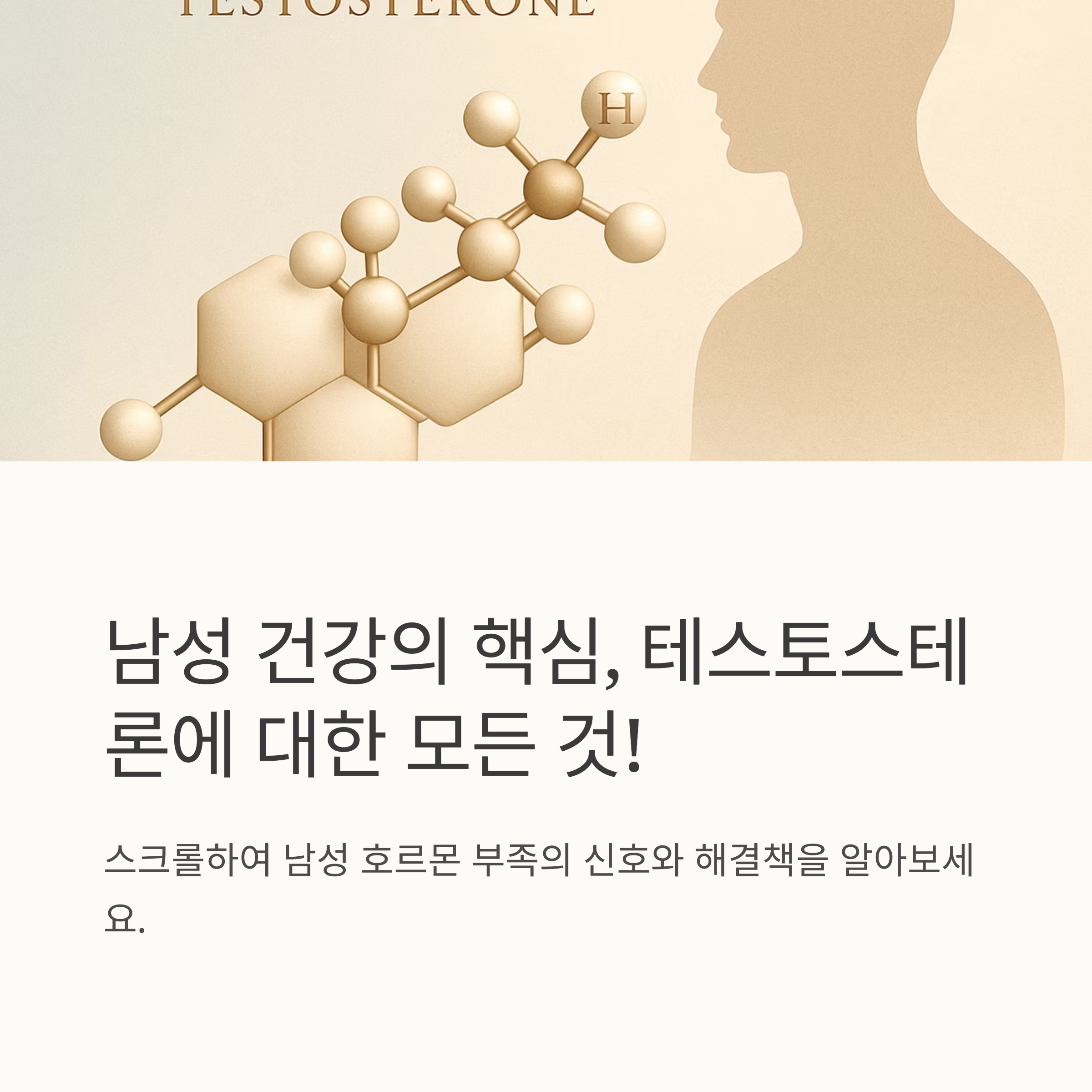 안녕하세요! 오늘은 남자에게 정말 중요한 호르몬, 테스토스테론에 대한 이야기를 나눠보려고 합니다. 이 호르몬이 부족하면 어떤 일이 생기는지, 그리고 그 해결책은 무엇인지 알려드릴게요. 건강한 중년, 그리고 노년을 위한 정보니까 꼭 끝까지 읽어주세요!