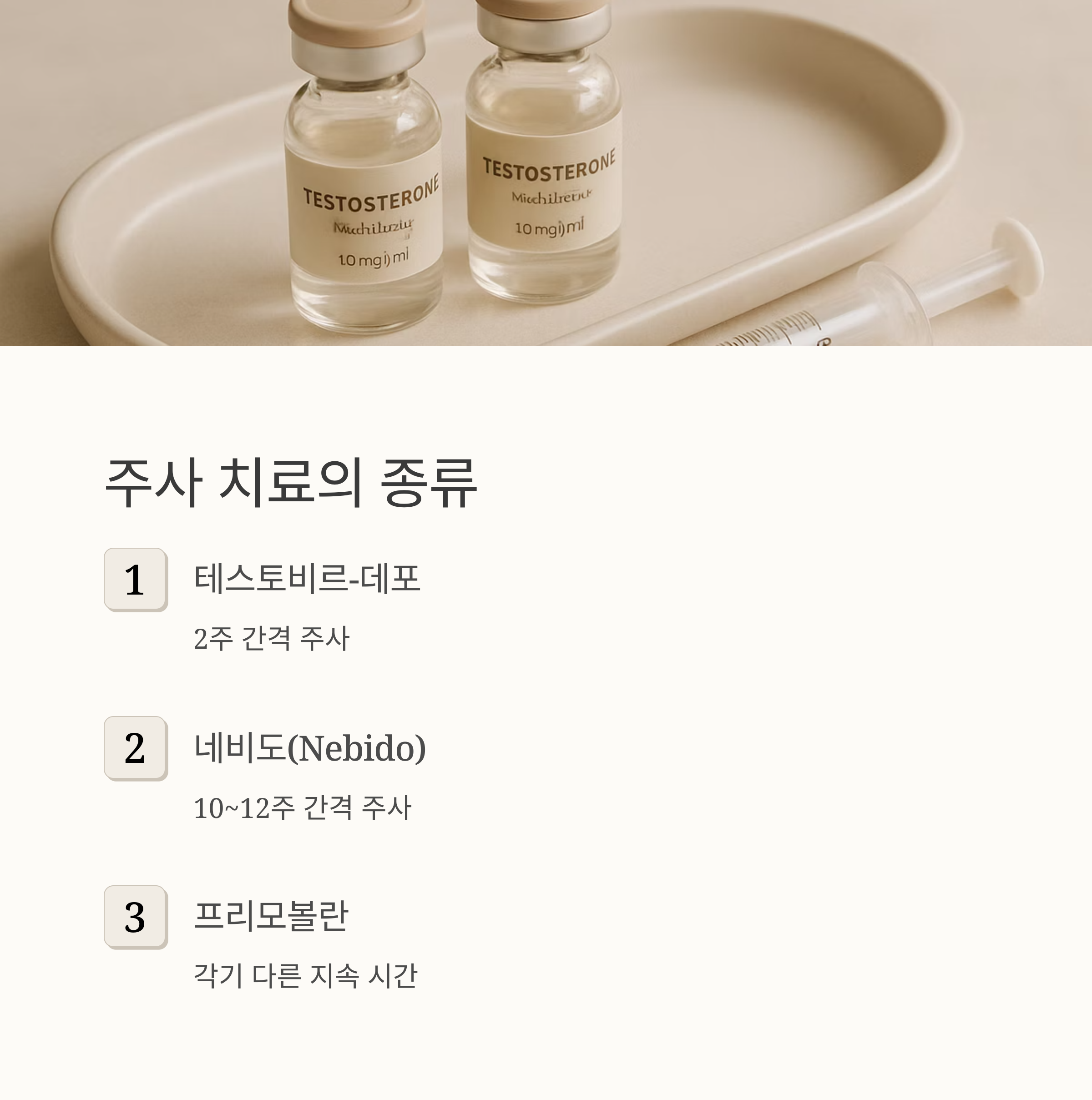 주사제는 테스토비르-데포, 네비도(Nebido), 프리모볼란 등 여러 종류가 있으며, 각 제품마다 주사 간격과 지속 시간이 다르다는 점을 기억해두세요. 예를 들어 테스토비르-데포는 2주 간격으로 맞아야 하지만, 네비도(Nebido)는 10~12주 간격으로 맞아도 효과가 지속됩니다. 자신에게 맞는 주사 간격과 제품을 선택하는 것은 의사와 충분한 상담을 통해 결정해야 합니다. 절대 스스로 판단해서는 안 됩니다. 전문가의 정확한 진단과 처방이 필요하다는 점을 꼭 기억해주세요.
