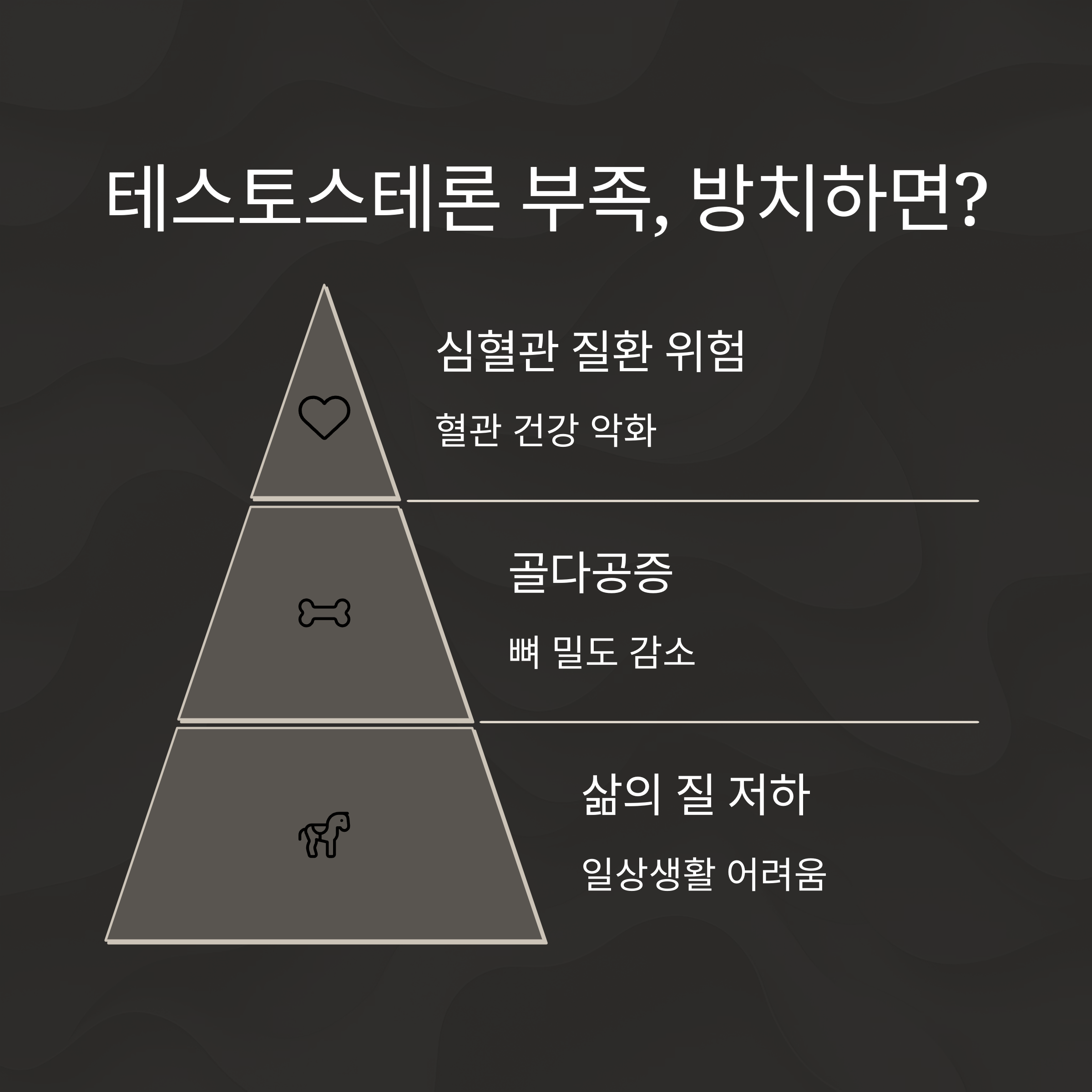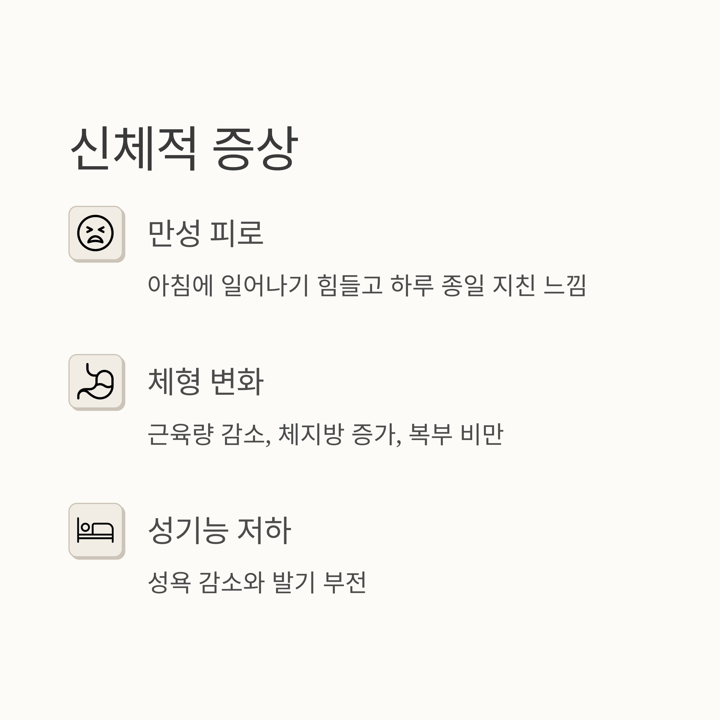 또, 근육량이 줄고 체지방이 늘어나면서 배가 나오는 복부 비만이 생기기도 해요. 이전에는 쉽게 할 수 있었던 운동도 힘들어지고, 옷 사이즈도 커지면서 자신감이 떨어지는 경험을 하게 됩니다. 심지어 성욕 감소와 발기 부전까지 겪을 수도 있고요.