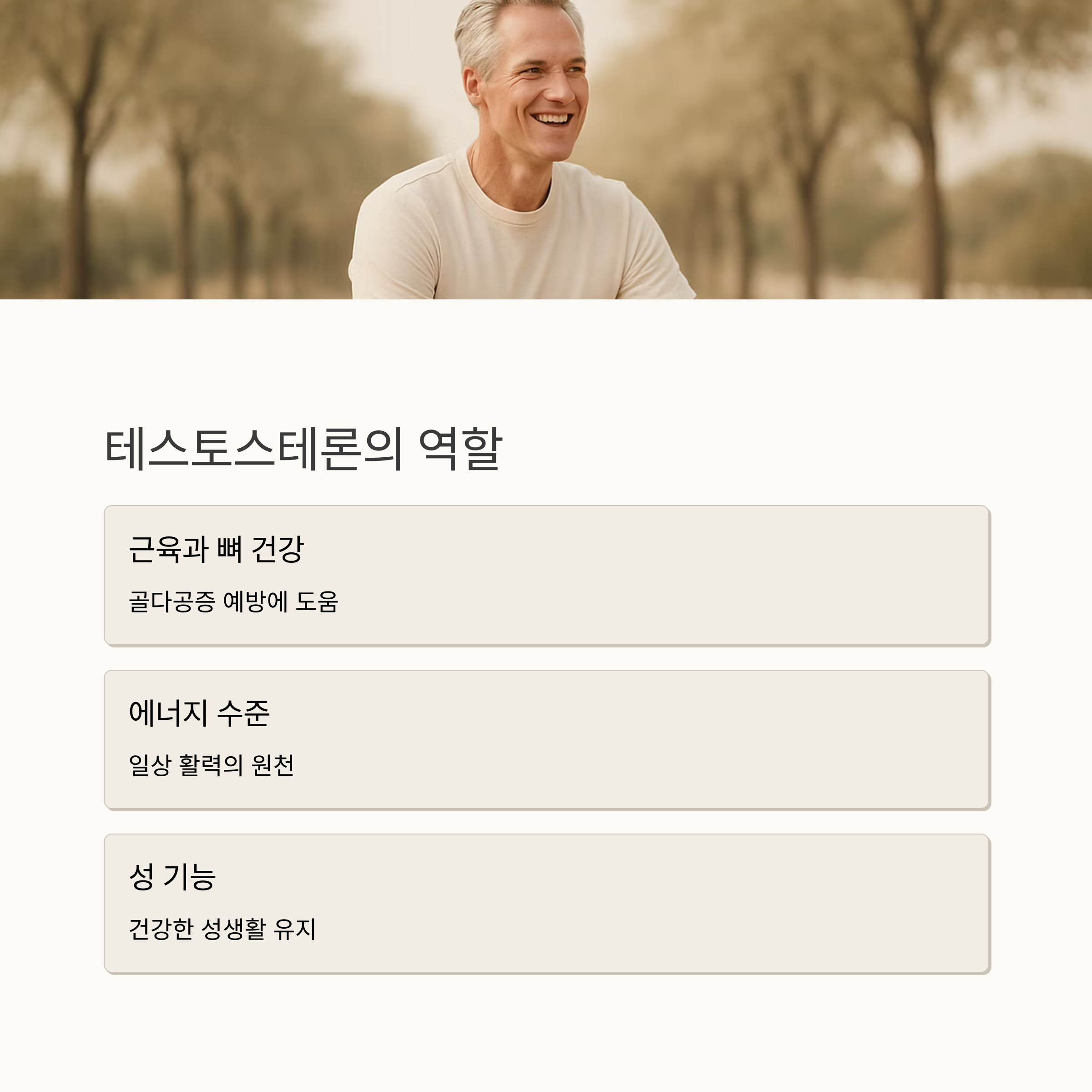 생각해보세요. 활기찬 하루를 보내는 데 에너지가 얼마나 중요한지! 테스토스테론은 그 에너지의 근원과도 같다고 할 수 있어요. 또한, 우리의 뼈를 튼튼하게 유지하는 데에도 중요한 역할을 하기 때문에 골다공증 예방에도 도움이 된답니다. 그리고 성 기능 유지에도 필수적이죠. 건강한 성생활은 삶의 질을 높이는 중요한 요소 중 하나니까요.