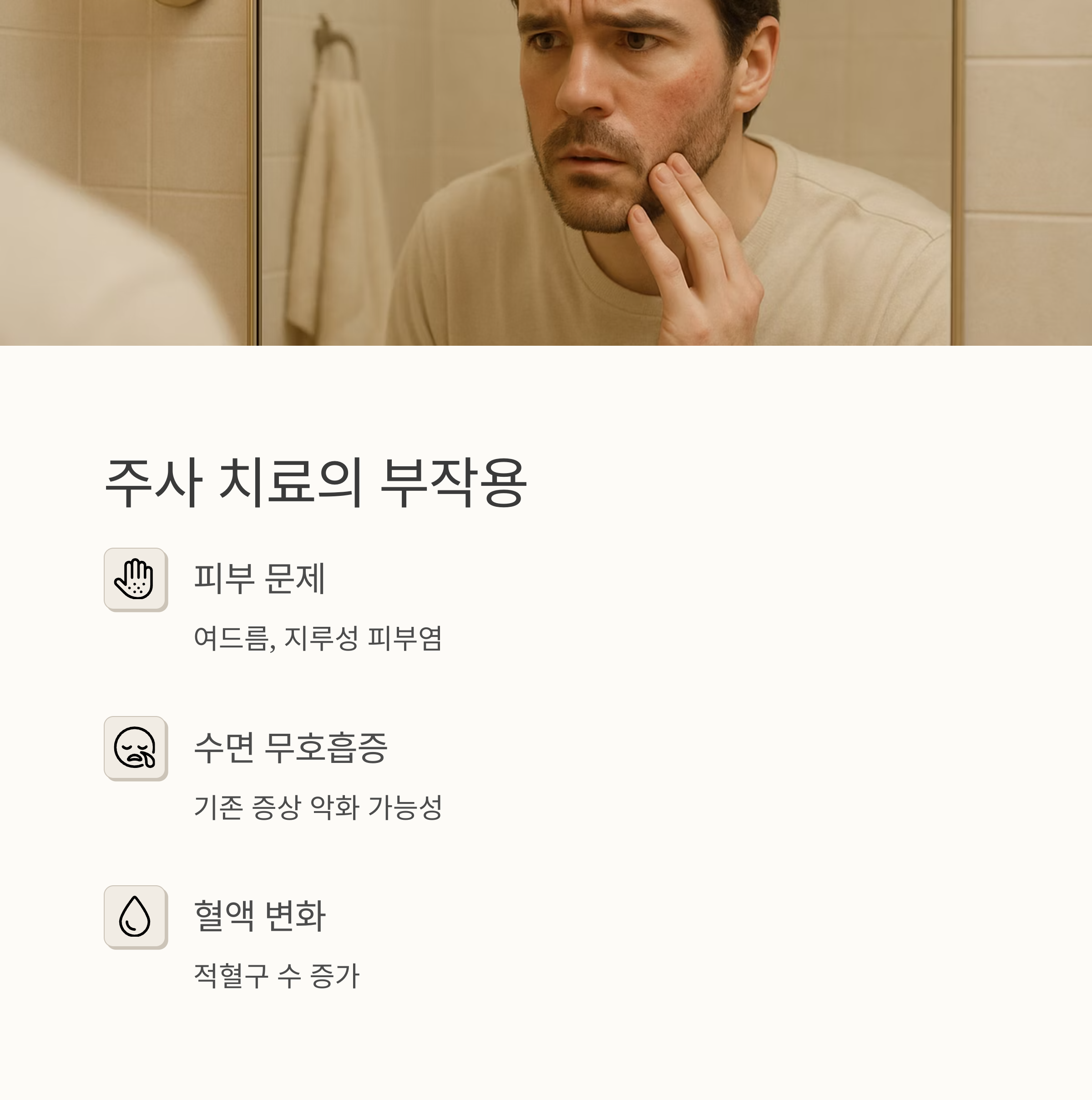 남성호르몬 주사는 효과가 좋은 만큼 부작용도 있을 수 있습니다. 여드름이나 지루성 피부염, 수면 무호흡증 악화, 정자 수 감소, 전립선 비대증 악화, 적혈구 수 증가 등이 나타날 수 있으니, 주사를 맞기 전에 의사와 충분히 상담하여 자신의 건강 상태를 고려해야 합니다. 특히, 전립선 질환이 있거나 간 기능에 문제가 있는 분들은 주의가 필요합니다.