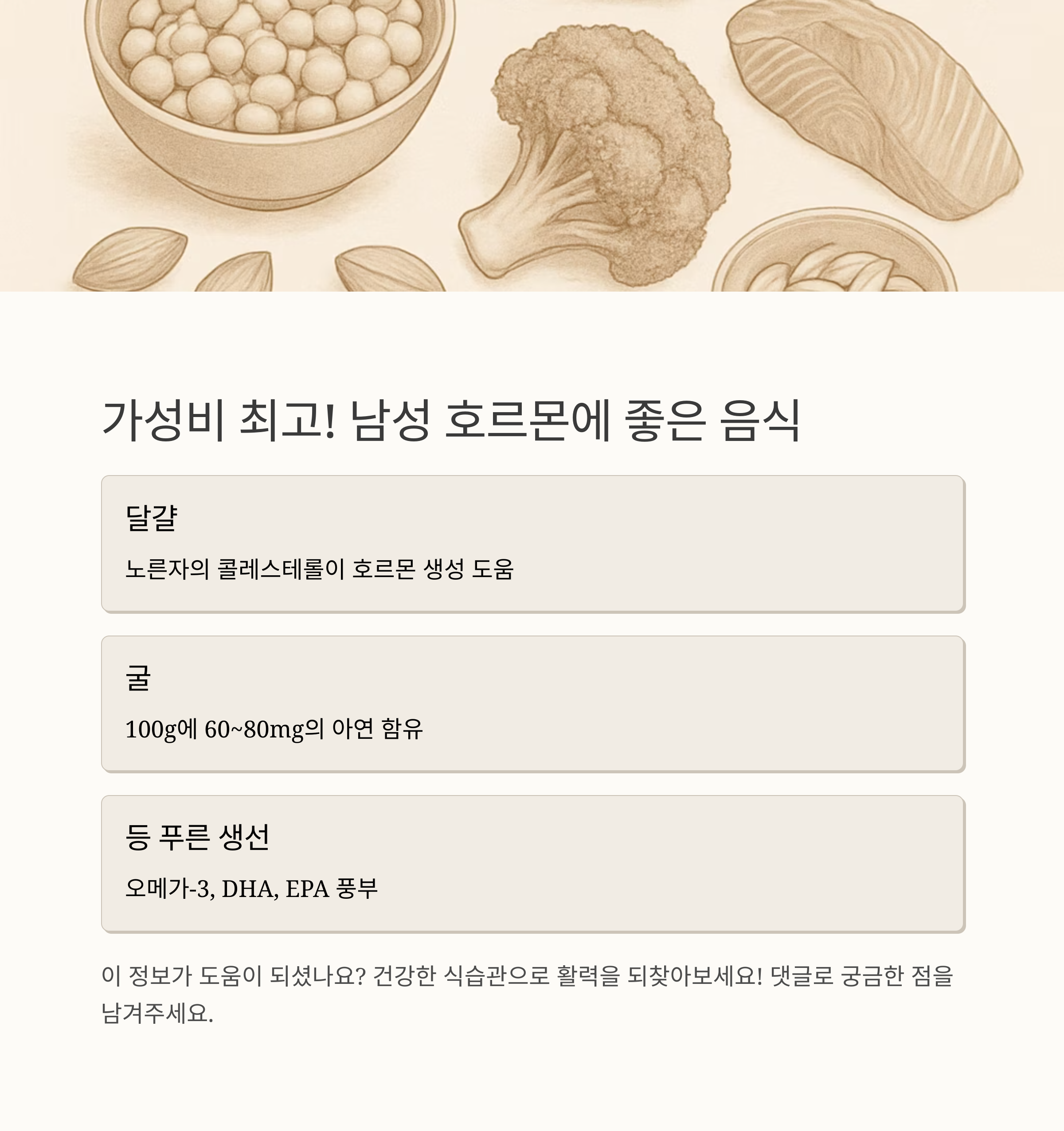 자, 오늘은 남성 호르몬에 좋은 가성비 음식들을 알아봤어요. 비싼 영양제나 보약 대신, 일상에서 쉽게 구할 수 있는 음식들로 건강을 챙길 수 있다는 사실! 정말 놀랍지 않나요? 오늘 소개해드린 음식들을 꾸준히 섭취하면서 건강한 생활 습관을 함께 유지한다면 더욱더 좋은 효과를 볼 수 있을 거예요.
