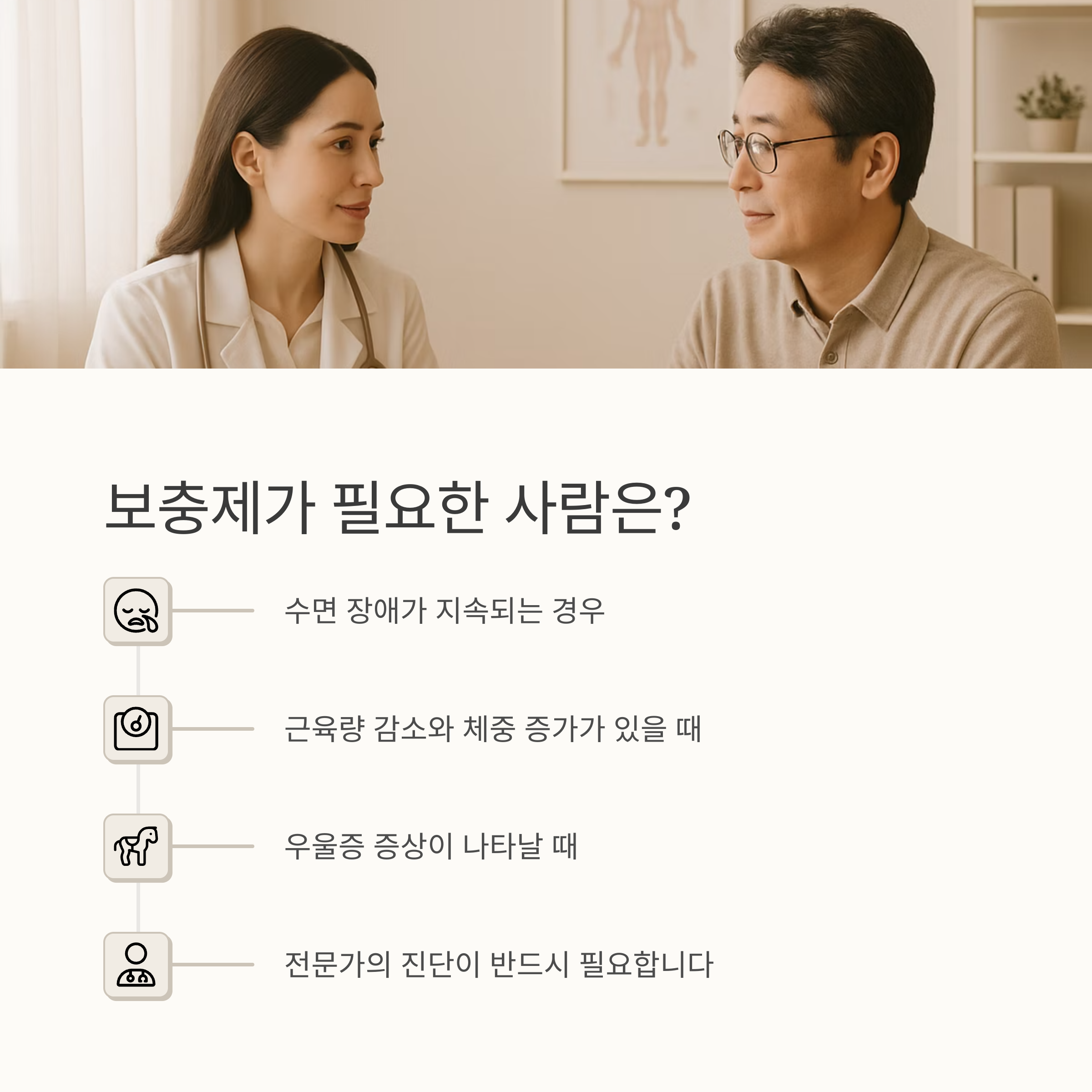 모든 남성에게 남성 호르몬 보충제가 필요한 건 아니에요. 테스토스테론 수치가 낮아 건강에 문제가 있을 때만 보충제를 고려해야 합니다. 만약 지속적인 피로감, 수면 장애, 우울증, 근육량 감소, 체중 증가, 성 기능 저하 등의 증상이 있다면 전문가의 진단을 받아보는 것이 좋습니다.