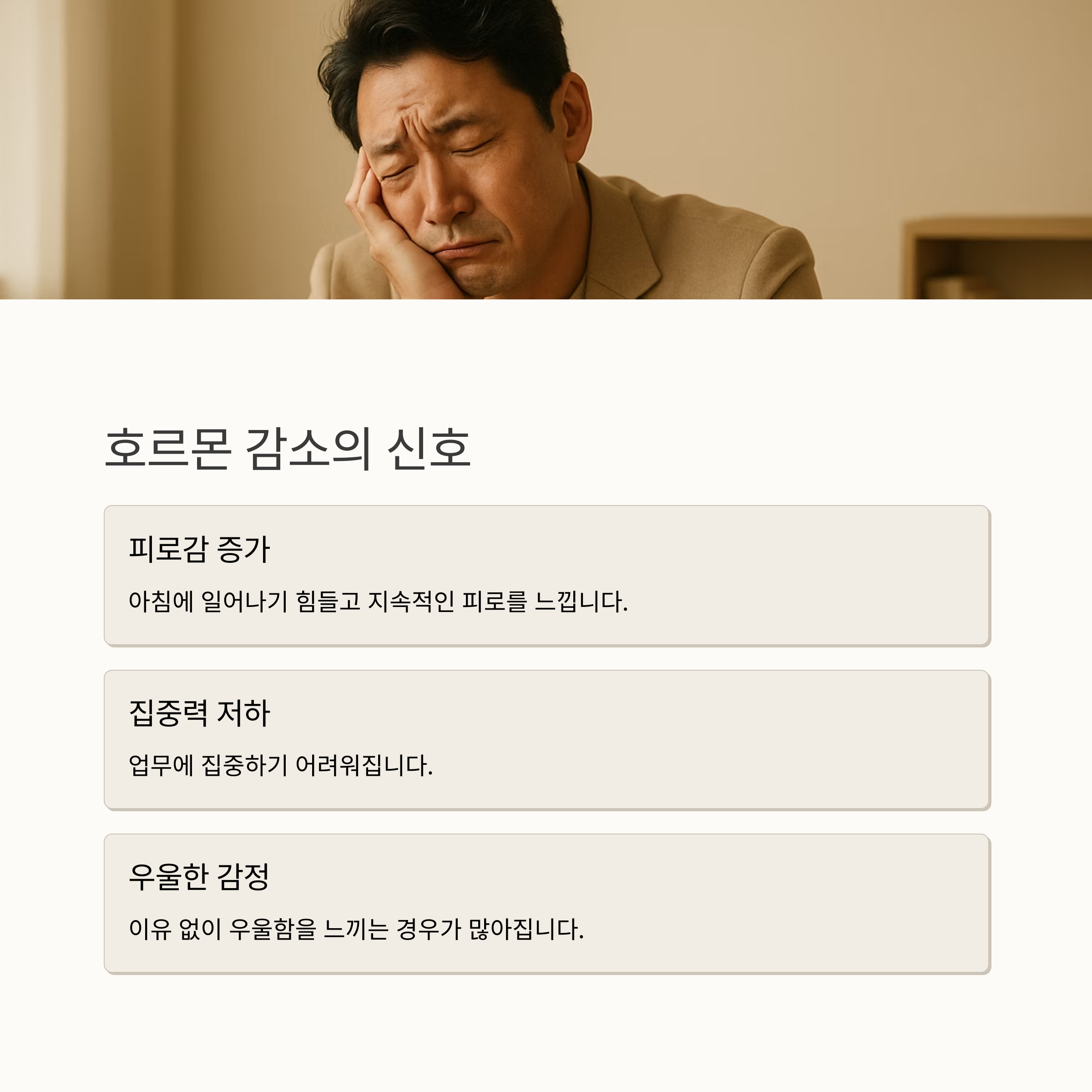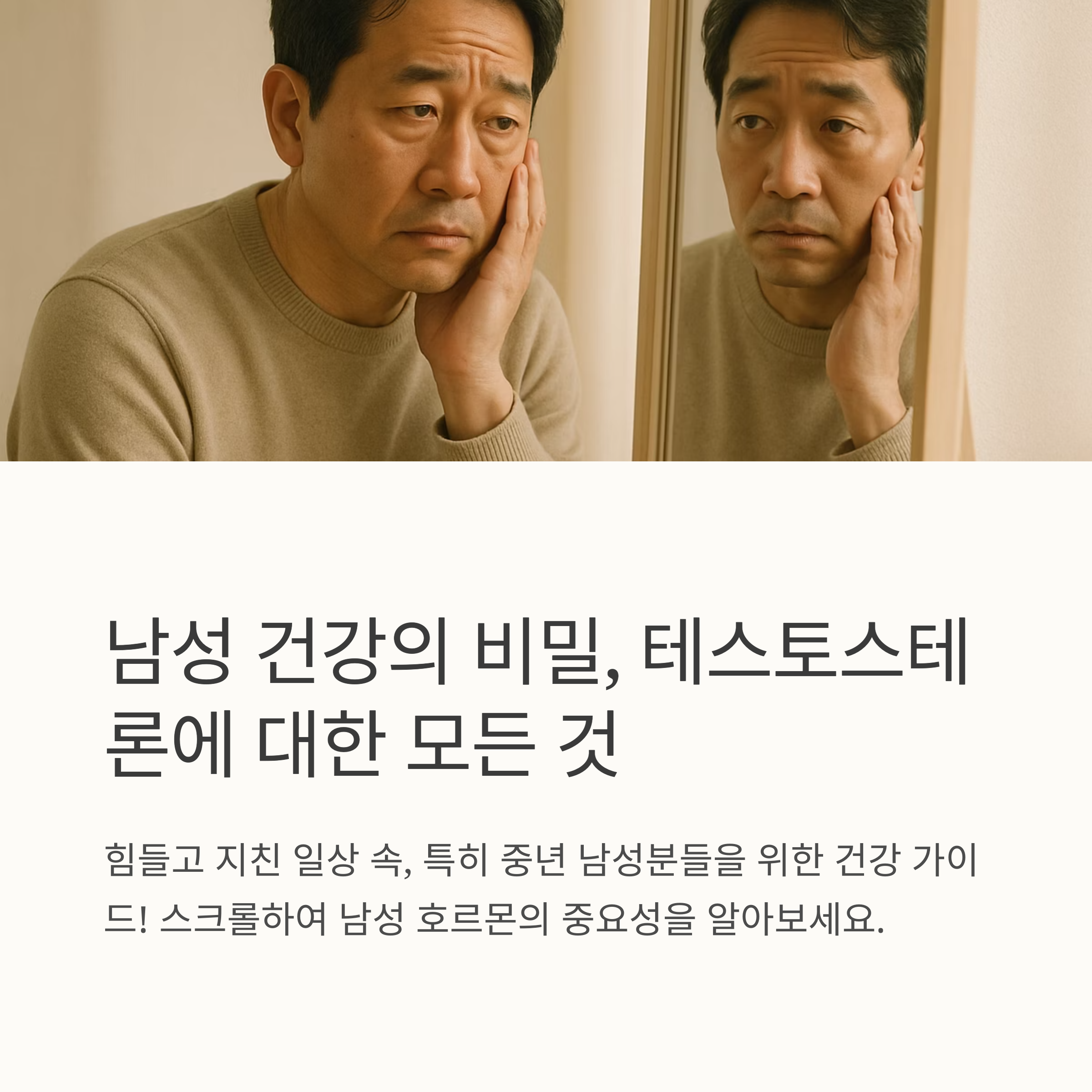 안녕하세요. 요즘 힘들고 지치는 일상 속에서 건강을 챙기기 어려운 분들 많으시죠? 특히, 중년 남성분들은 몸의 변화를 체감하며 걱정이 많으실 텐데요. 오늘은 남성 건강의 핵심, 남성 호르몬에 대해 꼼꼼하게 알아보고, 건강한 삶을 위한 현명한 선택을 도와드리겠습니다. 여러분의 건강한 미래를 응원합니다!