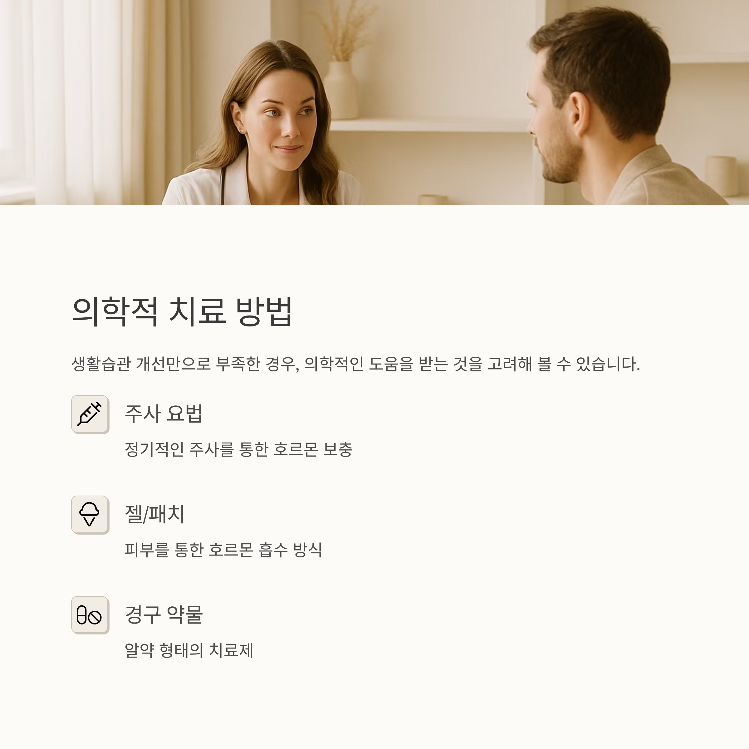 생활습관 개선만으로는 부족한 경우, 의학적인 도움을 받는 것을 고려해 볼 수 있습니다. 전문의와 상담하여 자신에게 맞는 치료법을 찾는 것이 중요해요. 의학적 치료는 호르몬 보충 요법을 통해 남성호르몬 수치를 개선하는 방법입니다. 주사, 젤, 패치, 알약 등 다양한 형태의 치료제가 있으며, 개인의 상태와 선호도에 따라 적절한 방법을 선택하게 됩니다.