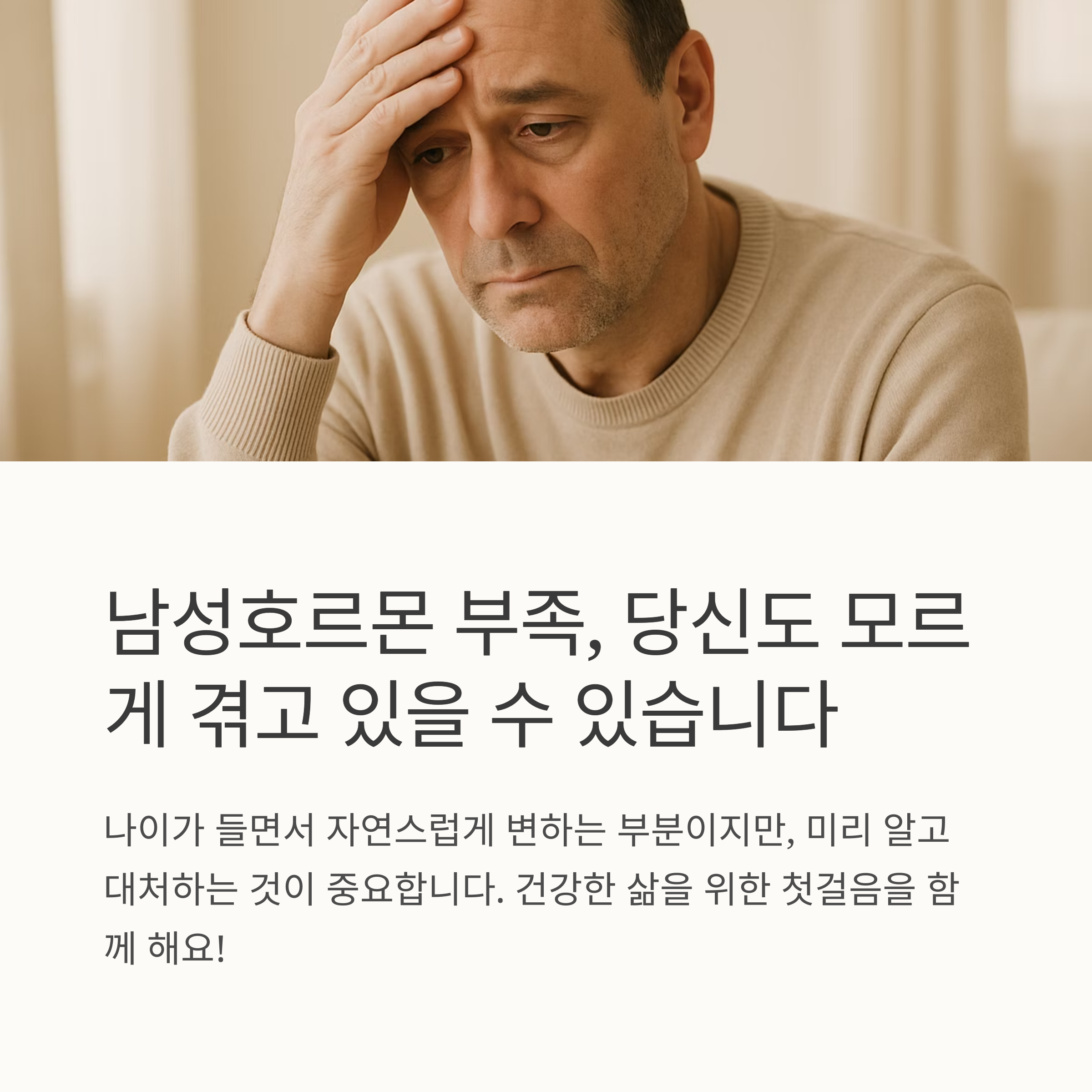 안녕하세요. 오늘은 남성 여러분의 건강에 중요한 영향을 미치는 남성호르몬에 대해 자세히 알아보는 시간을 갖도록 하겠습니다. 나이가 들면서 자연스럽게 변하는 부분이지만, 남성 호르몬 부족 증상이 심각해지기 전에 미리 알고 대처하는 것이 중요하다는 점을 강조하며 시작해보겠습니다. 건강한 삶을 위한 첫걸음을 함께 해요!