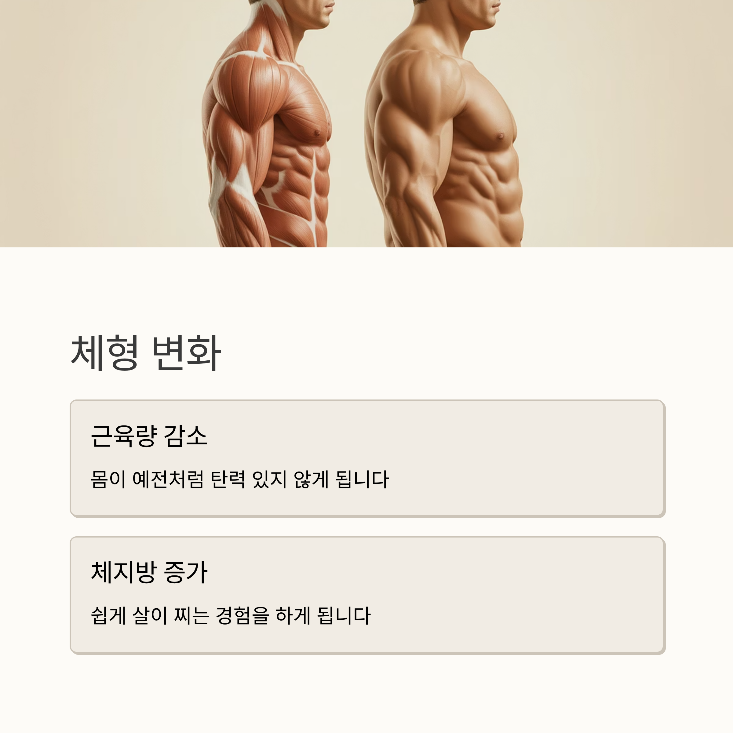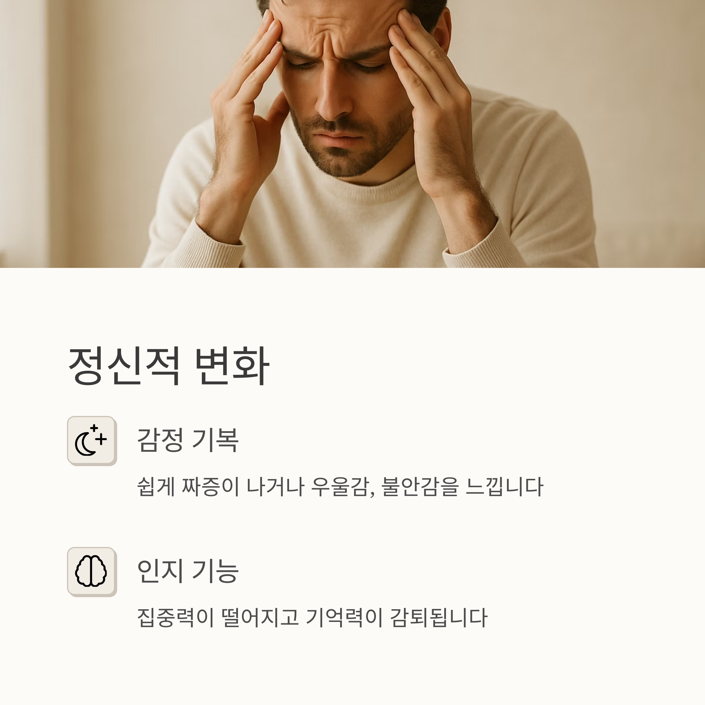 또, 만성적인 피로감을 느낄 수 있습니다. 충분히 잠을 자도 피곤함이 가시지 않고, 활력이 떨어지는 걸 느낄 수 있죠. 이 외에도 근육량이 줄어들고, 체지방이 증가하는 현상도 나타날 수 있습니다. 몸이 예전처럼 탄력 있지 않고, 쉽게 살이 찌는 경험을 하게 될 수도 있죠. 더불어, 감정 기복이 심해지거나 우울감, 불안감을 느낄 수도 있습니다.