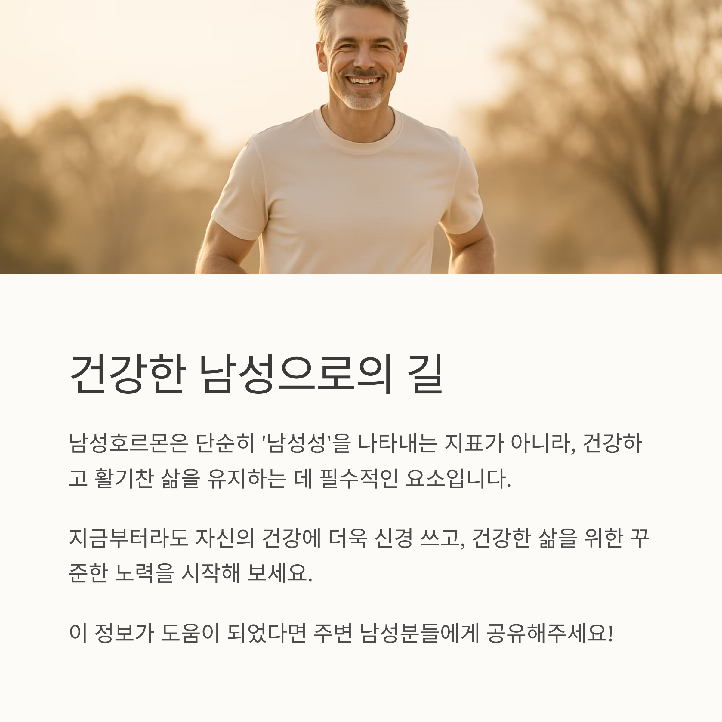 안녕하세요. 오늘은 남성 여러분의 건강에 중요한 영향을 미치는 남성호르몬에 대해 자세히 알아보는 시간을 갖도록 하겠습니다. 나이가 들면서 자연스럽게 변하는 부분이지만, 남성 호르몬 부족 증상이 심각해지기 전에 미리 알고 대처하는 것이 중요하다는 점을 강조하며 시작해보겠습니다. 건강한 삶을 위한 첫걸음을 함께 해요!