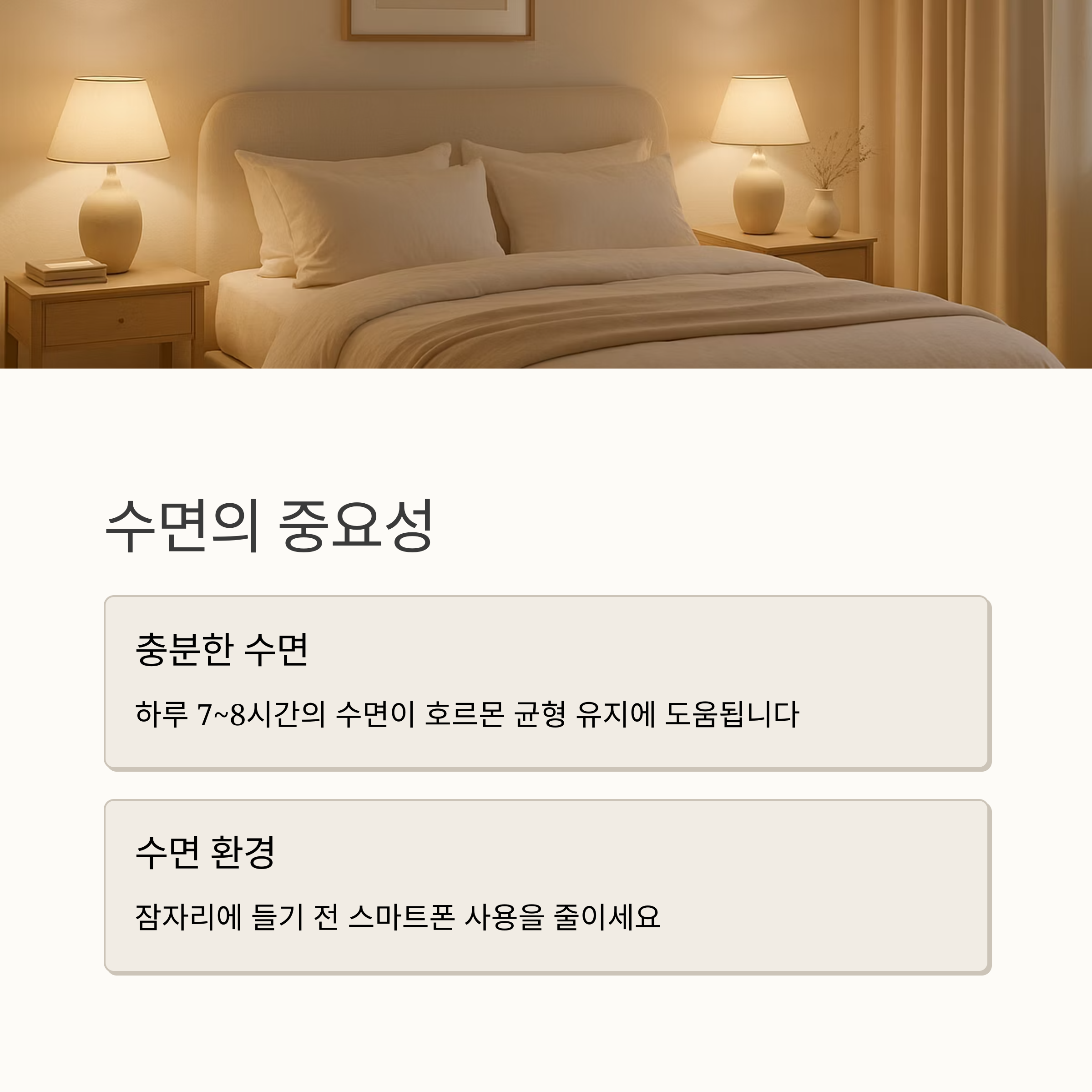 특히 중강도의 근력 운동이 효과적이에요. 하지만 과도한 운동은 오히려 스트레스 호르몬을 증가시켜 역효과를 낼 수 있으니 적절한 강도와 횟수를 유지하는 것이 중요해요. 충분한 수면 또한 필수입니다. 하루 7~8시간 정도의 충분한 수면은 호르몬 균형 유지에 큰 도움을 줘요. 잠자리에 들기 전 스마트폰 사용을 줄이고, 편안한 분위기를 조성하는 것도 중요하죠.