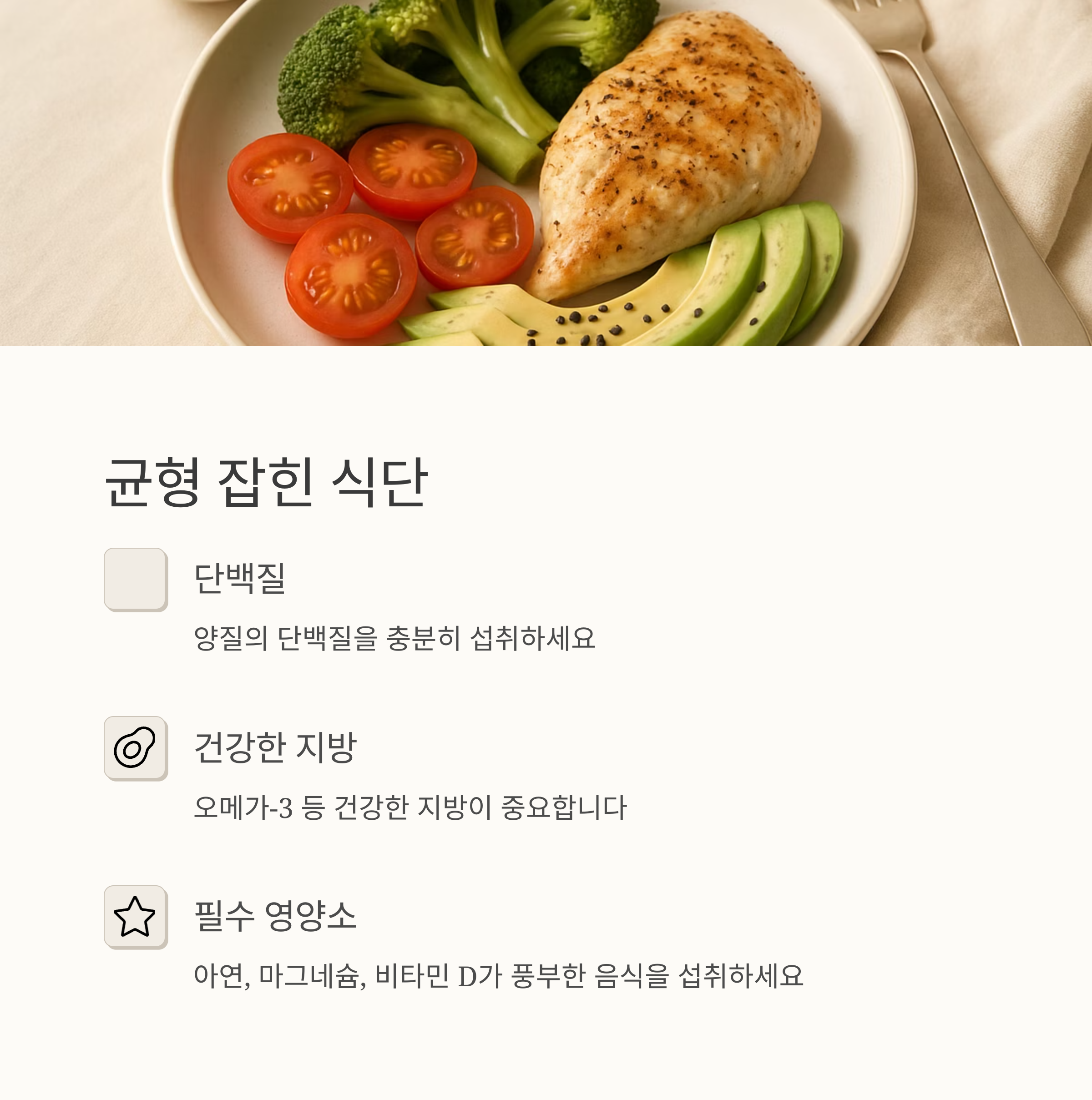 균형 잡힌 식단도 빼놓을 수 없어요. 단백질, 건강한 지방, 신선한 채소와 과일을 충분히 섭취해야 해요. 아연, 마그네슘, 비타민 D 같은 영양소가 풍부한 음식을 섭취하는 것도 좋고요. 스트레스 관리 또한 중요합니다.