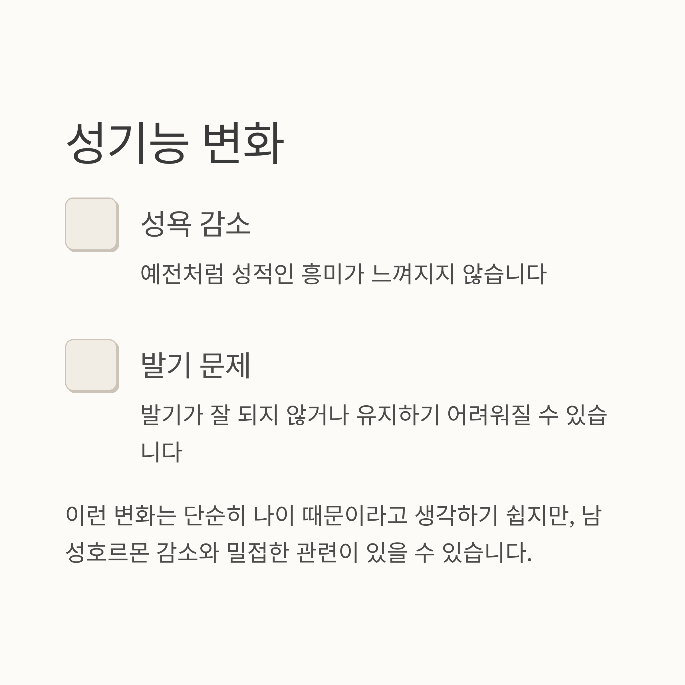 남성호르몬이 부족해지면 어떤 변화가 생길까요? 자동차의 엔진 오일이 부족해지면 제대로 작동하지 못하는 것처럼, 우리 몸도 제 기능을 못하게 될 수 있어요. 가장 흔하게 나타나는 증상은 성욕 감소입니다. 예전처럼 성적인 흥미가 느껴지지 않고, 발기가 잘 되지 않거나 유지하기 어려워질 수도 있죠. 이런 변화는 단순히 나이 때문이라고 생각하기 쉽지만, 남성호르몬 감소와 밀접한 관련이 있을 수 있어요.