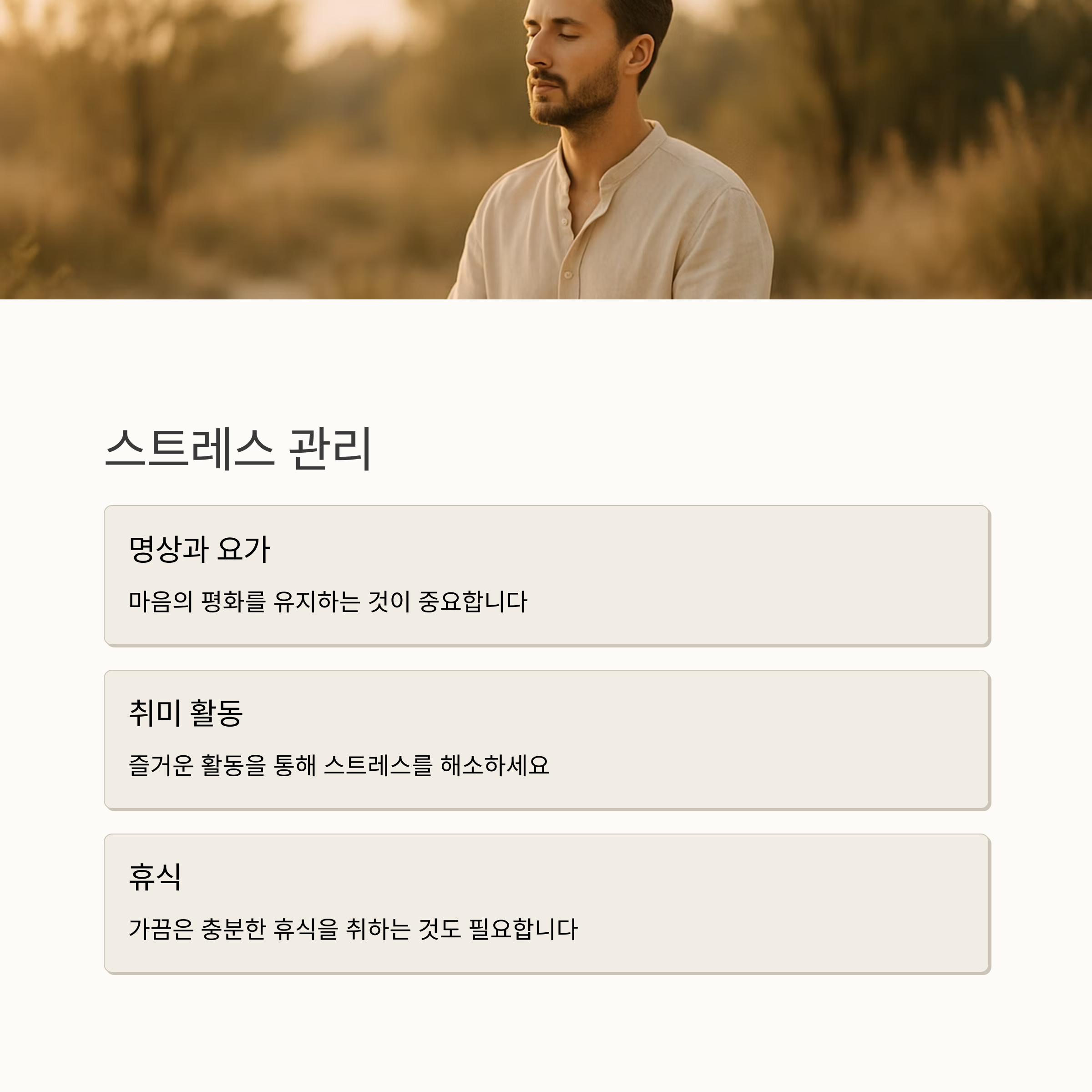 요가, 명상, 취미 활동 등을 통해 스트레스를 해소하고, 마음의 평화를 유지하는 것이 남성호르몬 관리에 큰 도움을 줄 수 있습니다. 가끔은 휴식을 취하고 자신에게 충분한 시간을 할애하는 것도 중요합니다. 바쁜 일상 속에서 잠시 멈춰 서서 자신의 몸과 마음에 귀 기울여보세요.