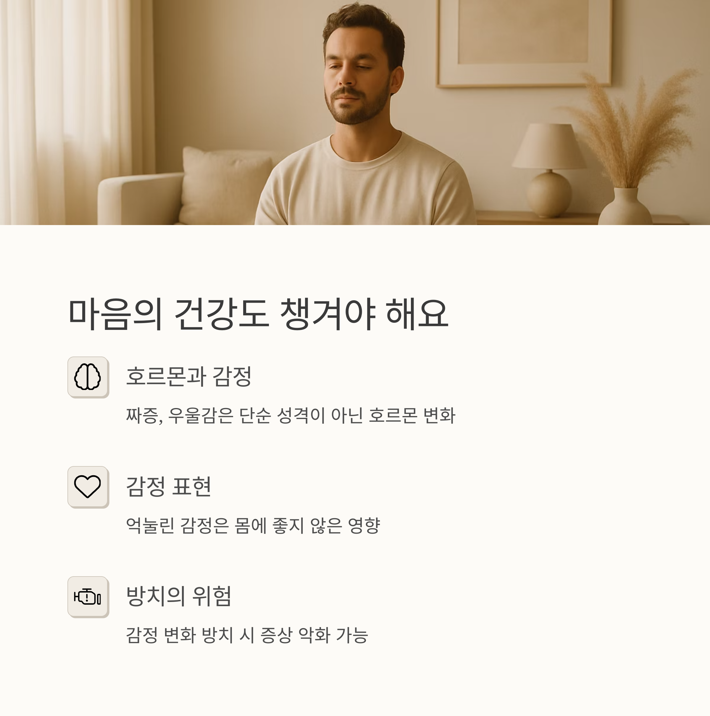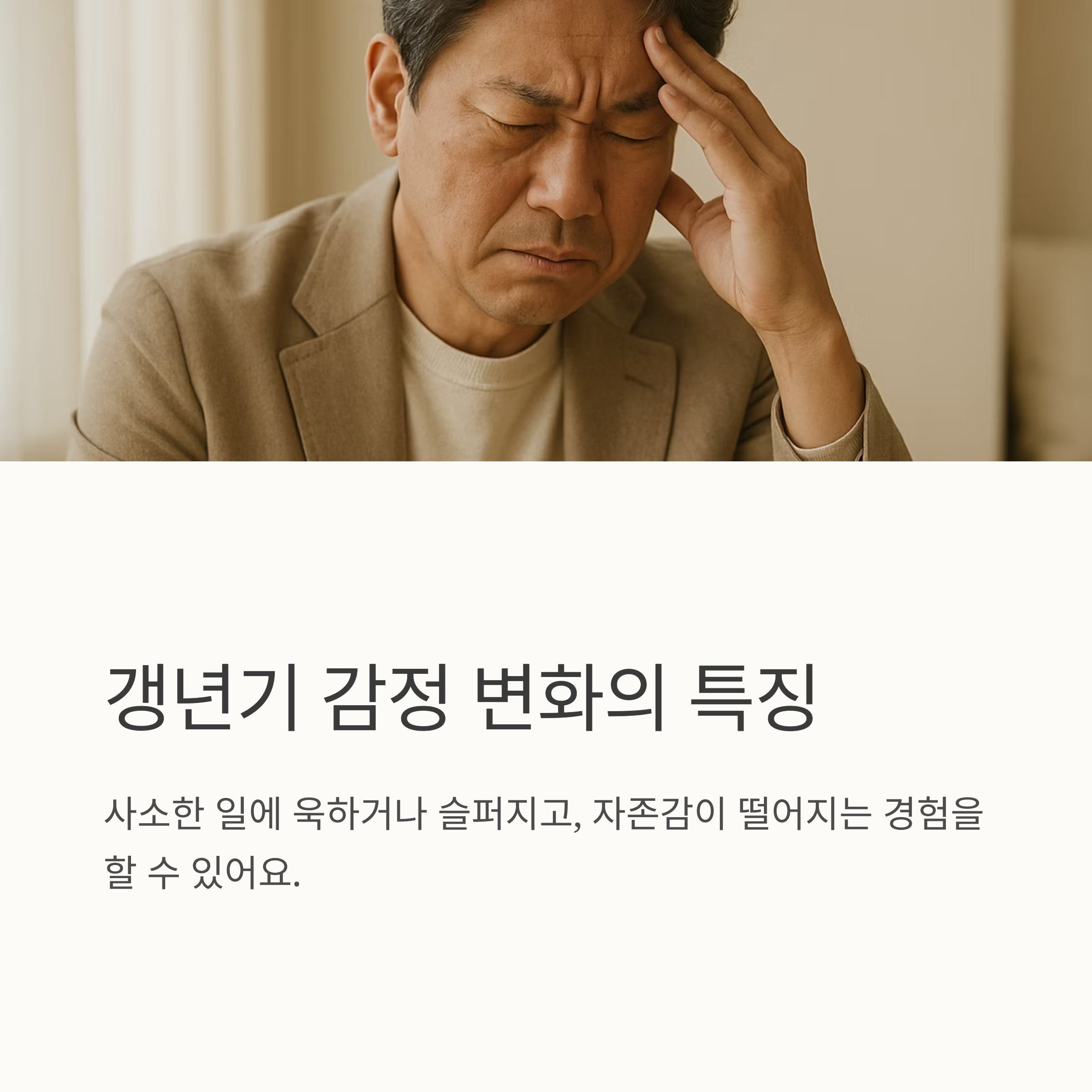 갱년기에는 짜증이나 우울감 같은 감정 변화도 흔하게 나타납니다. 이런 감정 변화는 단순히 성격 탓이 아닌, 호르몬 변화와 깊이 연관되어 있어요. 많은 남성들이 감정 표현을 꺼리지만, 억눌린 감정은 몸에 좋지 않은 영향을 미치죠. 갱년기에 접어들면 사소한 일에도 욱하거나 슬퍼지고, 자존감이 떨어지는 경험을 하게 될 수 있어요.