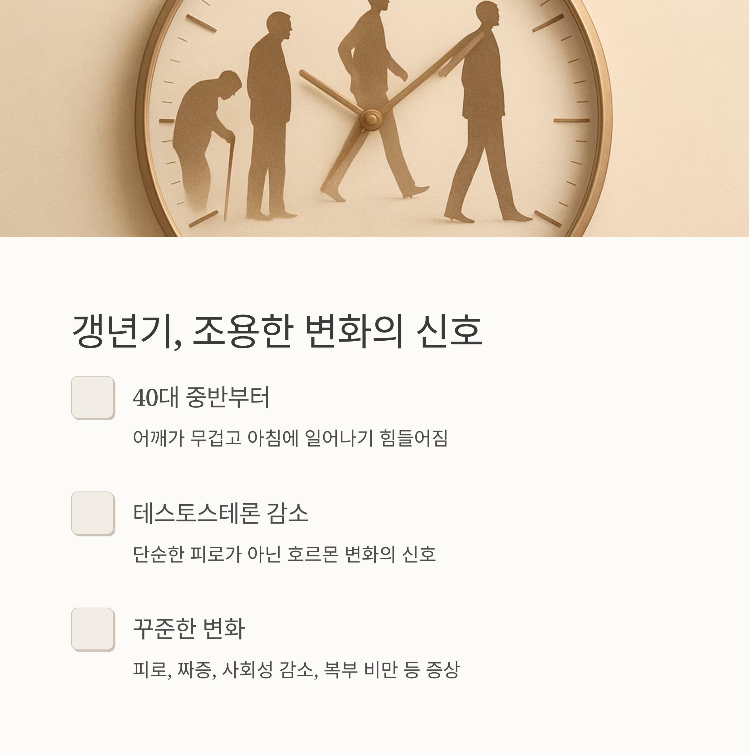 남자 갱년기 나이, 솔직히 말해서 겪어보기 전까진 잘 모르죠. 어느 날 갑자기 찾아오는 것도 아니고, 몸이 슬그머니 삐걱거리는 것처럼 시작하니까요. 40대 중반쯤부터 어깨가 무겁고, 아침에 일어나는 게 힘들어지고, 예전엔 재밌었던 농담이 시들해 보이는 경험, 해보셨나요? 그냥 나이 먹어서 그런가, 피곤해서 그런가, 스트레스 받아서 그런가 하고 넘기기 쉽지만, 사실 이런 증상들은 테스토스테론이라는 남성 호르몬의 감소와 깊은 연관이 있을 수 있어요.
