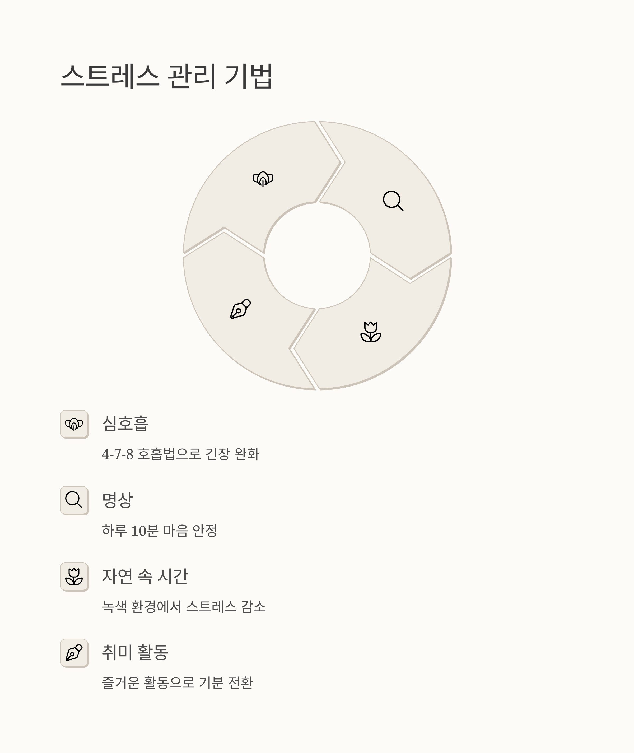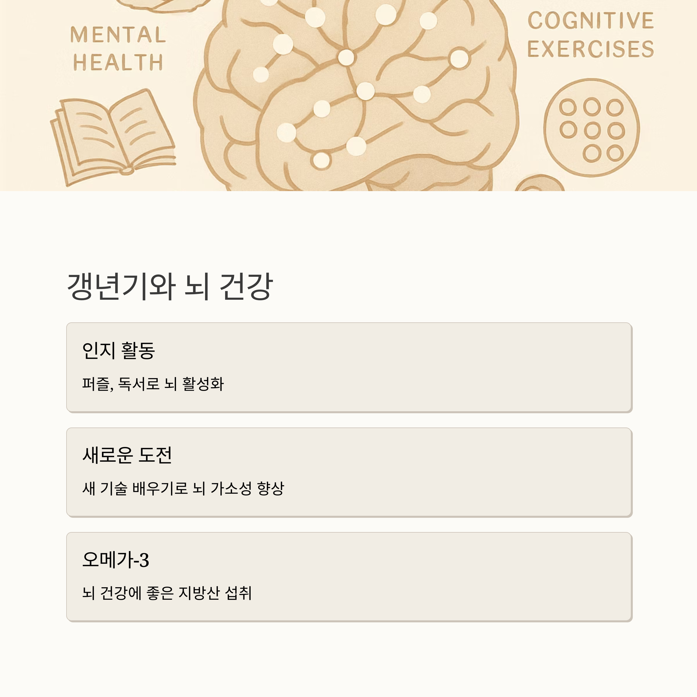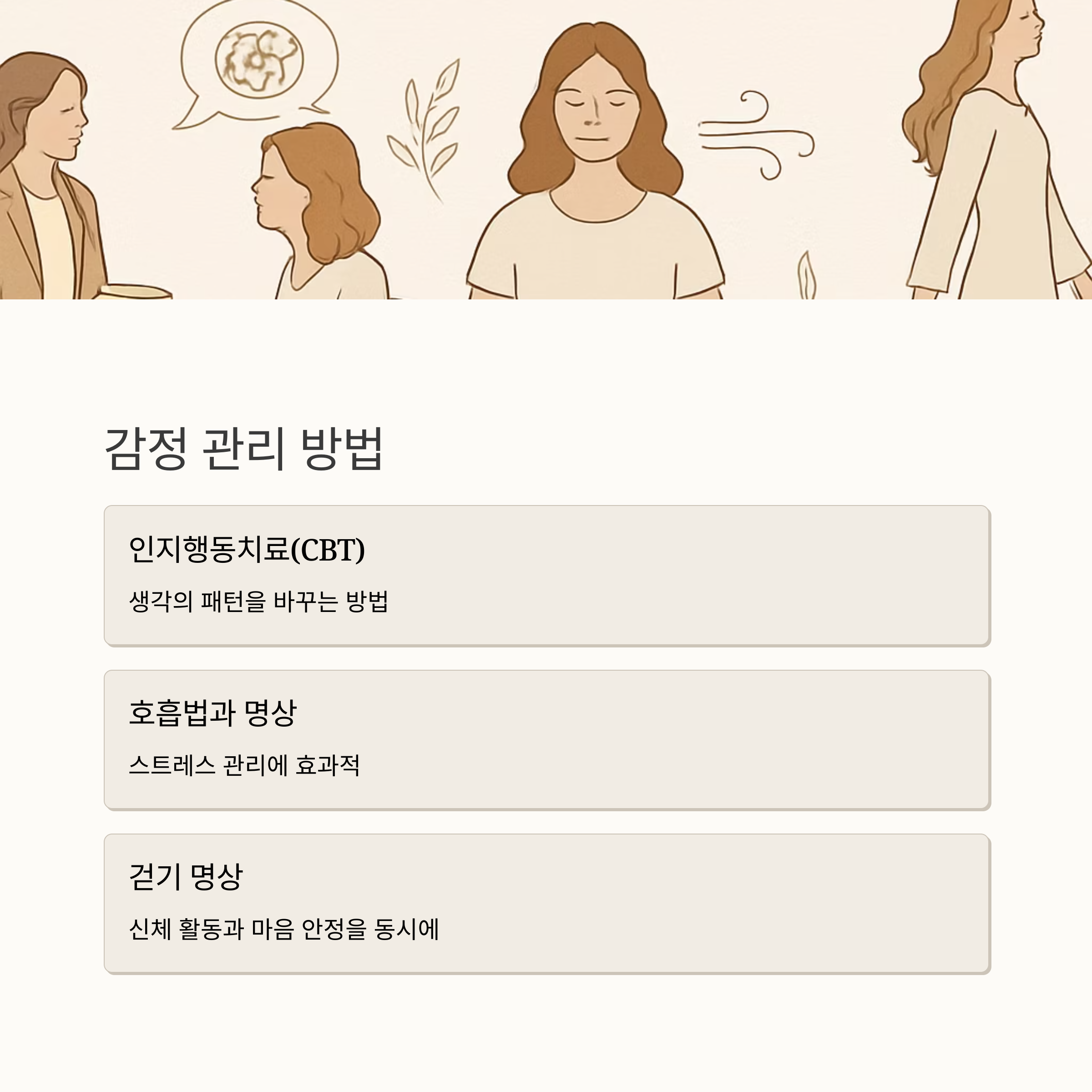 이러한 감정 변화는 방치하면 증상이 악화될 수 있으므로 적극적인 관리가 필요합니다. 인지행동치료(CBT)처럼 생각의 패턴을 바꾸는 방법이나, 호흡법, 명상, 걷기 명상 등 스트레스를 관리하는 방법들이 도움이 될 수 있습니다. 몸과 마음은 서로 연결되어 있기 때문에, 육체적인 관리와 더불어 정신적인 관리도 병행해야 시너지 효과를 볼 수 있습니다. 갱년기 극복에는 몸과 마음의 건강 모두를 챙기는 것이 중요합니다.