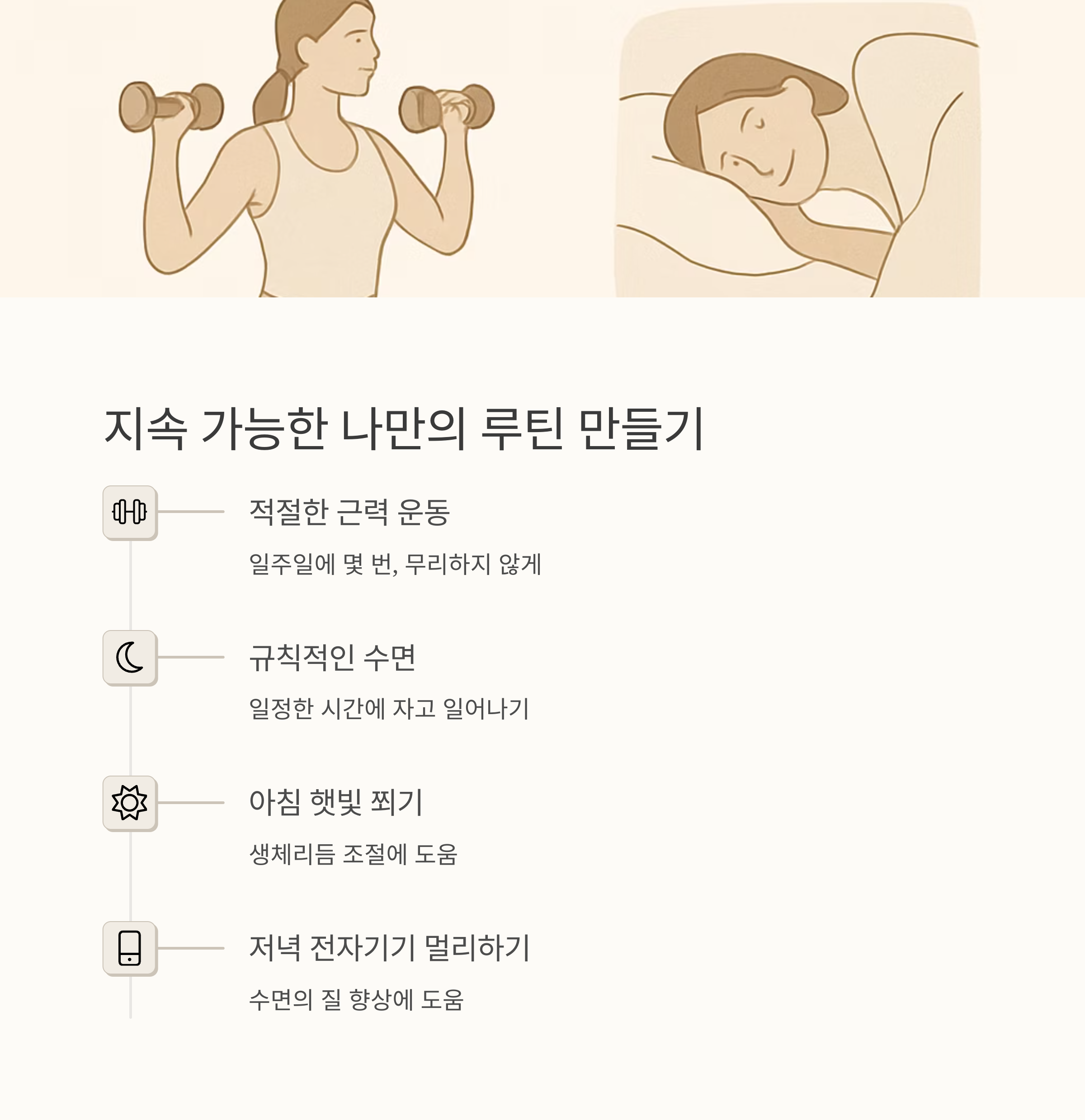 갱년기 증상이 반복되고 힘들다면, 이제는 ‘대충’이 아니라 ‘정확하게’ 나에게 맞는 관리 방법을 찾아야 합니다. 꾸준히 실천 가능한 루틴을 만드는 것이 중요해요. 예를 들어, 일주일에 몇 번 무리하지 않는 근력 운동을 하고, 규칙적인 수면 시간을 유지하며, 아침에는 햇빛을 쬐고 저녁에는 전자기기를 멀리하는 습관을 들이는 것이죠.