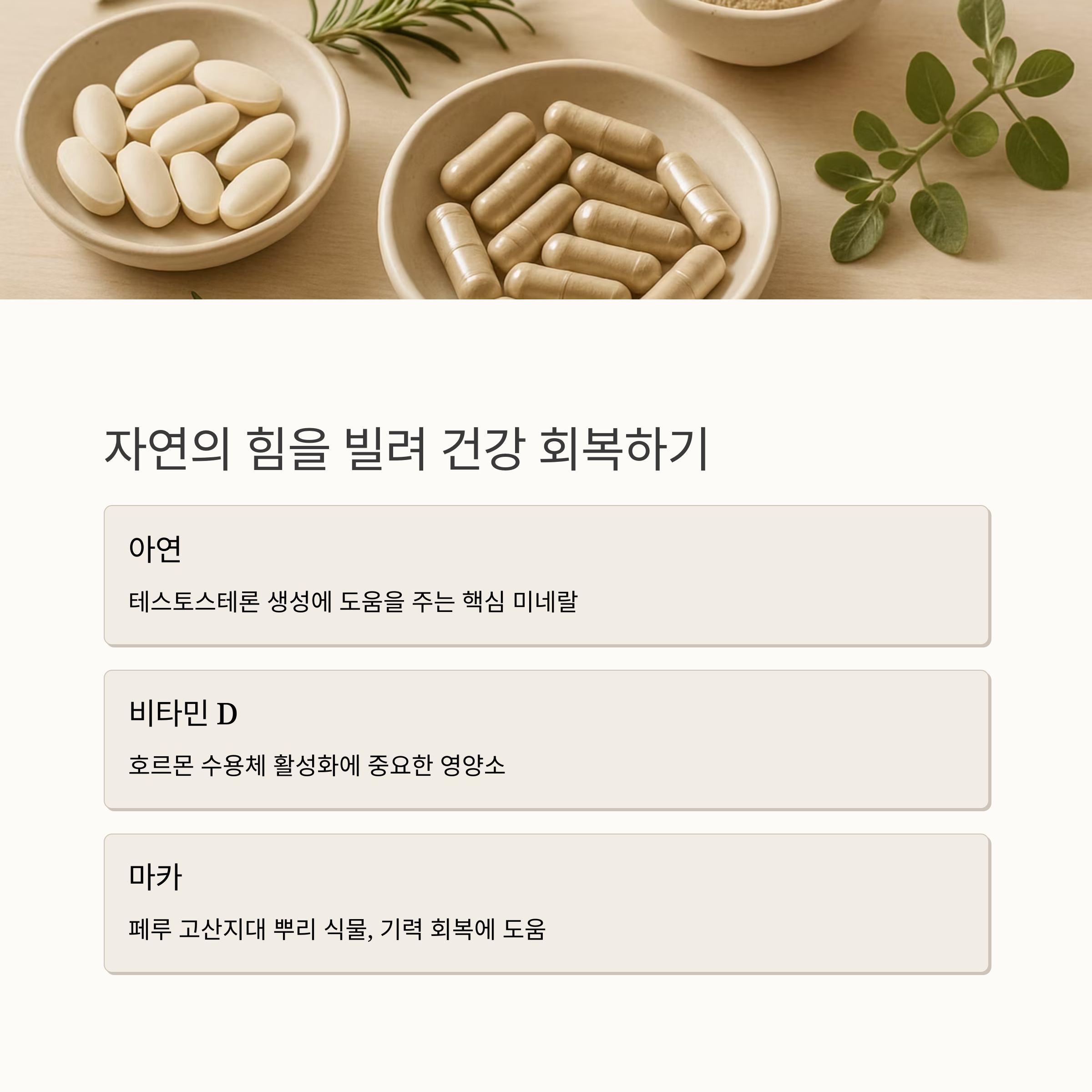 건강을 되찾고 싶다면, 무턱대고 약부터 찾기보다는 자연에서 얻을 수 있는 영양제부터 고려해보는 건 어떨까요? 아연은 테스토스테론 생성에 도움을 주는 핵심 미네랄이고, 요즘처럼 햇빛을 쬘 기회가 부족한 현대인에게는 비타민 D가 중요합니다. 비타민 D는 호르몬 수용체 활성화에 도움을 주죠.
