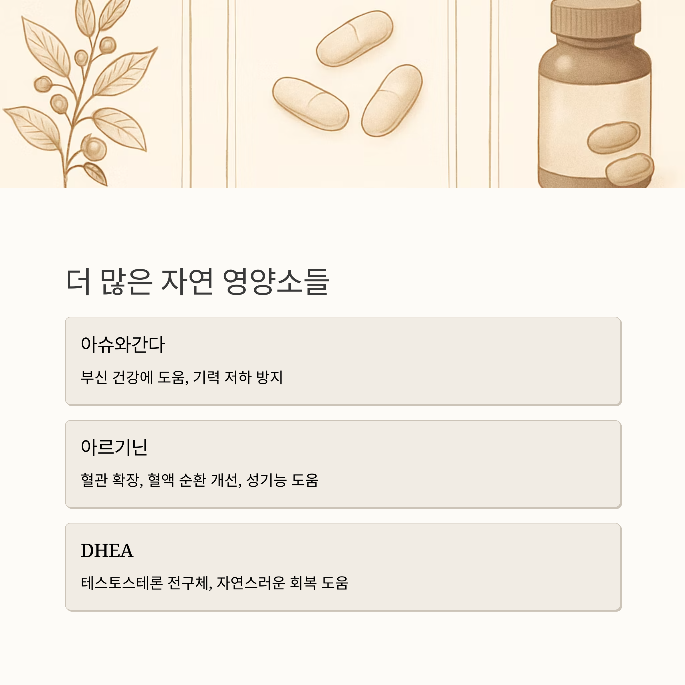 또, 페루 고산지대의 뿌리 식물인 마카는 기력 회복에 도움이 되는 것으로 알려져 있고, 아슈와간다는 부신 건강에 도움을 주어 기력 저하를 막는 데 효과적입니다. 혈관 확장에 도움을 주는 아르기닌은 혈액 순환을 개선하여 성기능 개선에도 도움을 줄 수 있습니다. 마지막으로 DHEA는 테스토스테론의 전구체 호르몬으로 몸의 자연스러운 회복을 돕습니다.