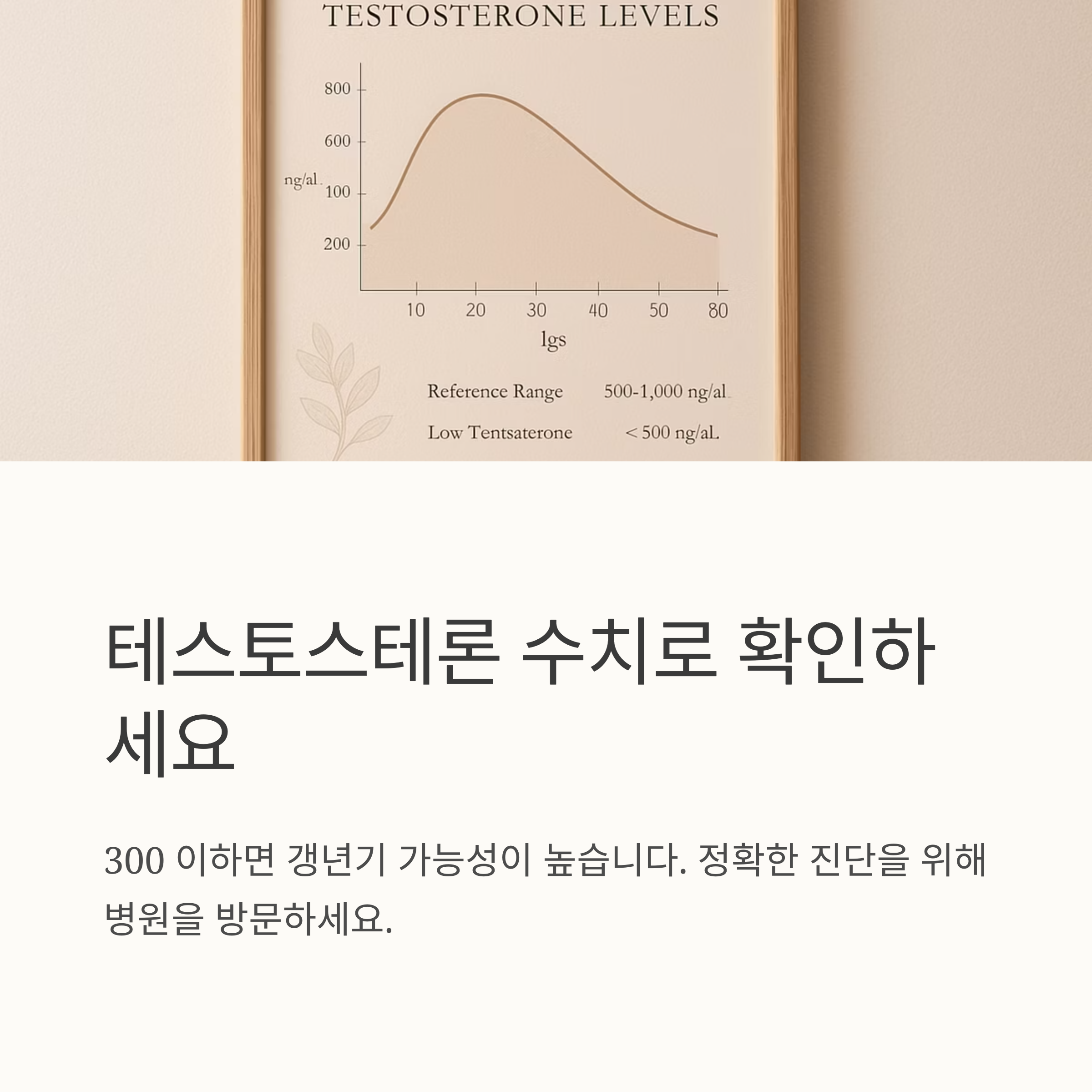 갱년기 증상을 의심한다면, 가장 먼저 병원을 찾아 혈액 검사를 받아보는 게 좋아요. 아침 공복에 채혈하여 총 테스토스테론과 자유 테스토스테론 수치를 확인하는 것이죠. 보통 300(단위 생략)을 기준으로 낮다면 갱년기 가능성이 높다고 판단할 수 있습니다. 혈액 검사만으로는 부족하다고 느껴진다면 AMS라는 설문조사를 병행해 볼 수 있어요.