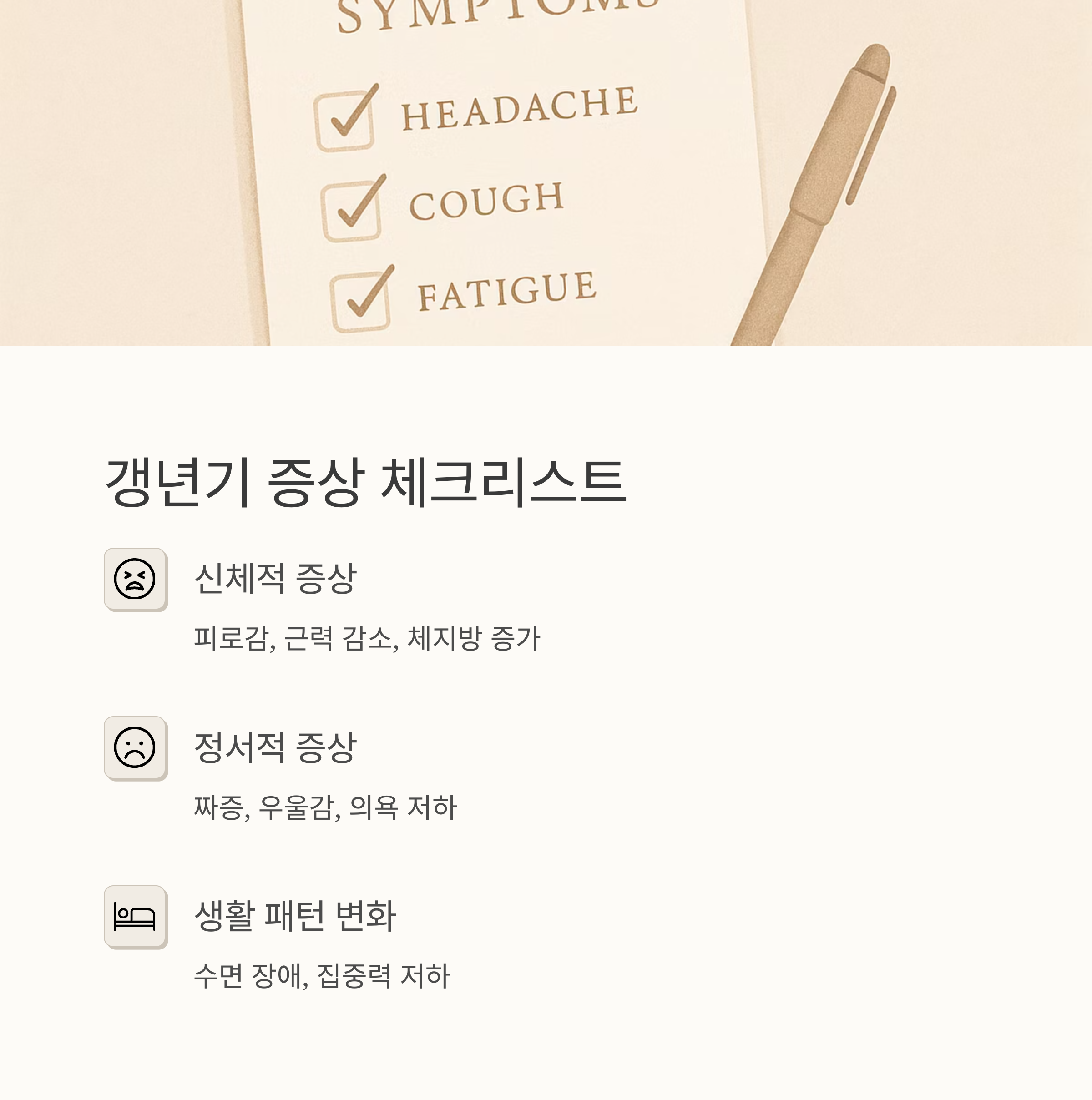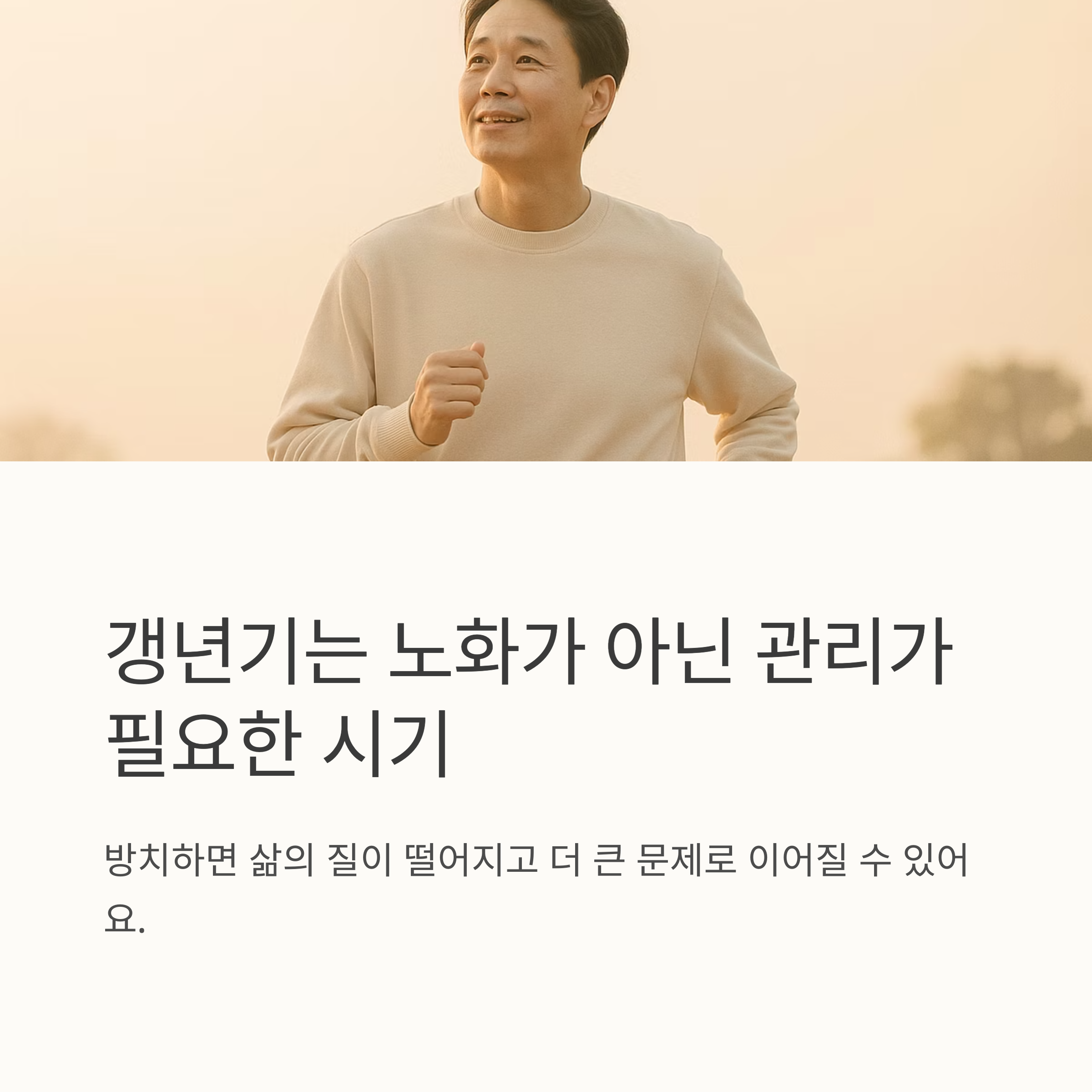 단순히 피로나 스트레스로 치부하기엔, 몸의 변화가 조금씩, 그리고 꾸준히 나타나기 때문에 갱년기 가능성을 의심해볼 필요가 있습니다. 피곤함이 쉽게 가시지 않고, 짜증이 늘고, 사람 만나는 게 귀찮아지고, 심지어 배만 나오기 시작한다면 더욱 주의해야 해요. 이런 변화들은 삶의 질을 떨어뜨릴 수 있고, 방치하면 더 큰 문제로 이어질 수도 있으니, 내 몸의 신호에 귀 기울여 보는 게 중요합니다. 갱년기는 단순한 노화의 과정이 아니라, 적극적인 관리가 필요한 시기라는 것을 기억해주세요.