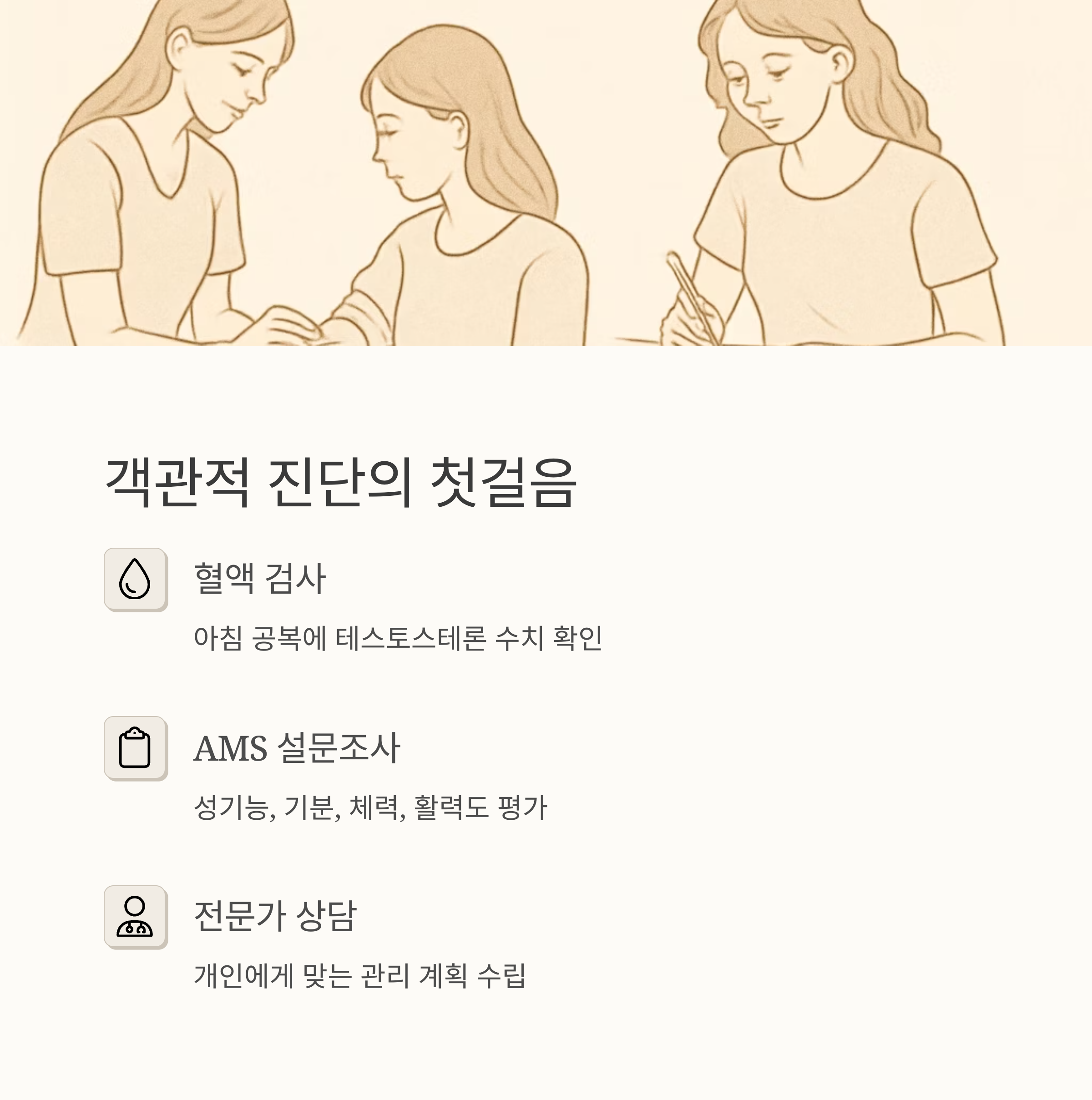 AMS는 성기능, 기분, 체력, 전반적인 활력도를 평가하는 설문으로, 숫자로 나타나는 혈액 검사 결과와 주관적인 느낌을 함께 고려하여 더욱 정확한 진단을 내릴 수 있도록 도와줍니다. 진단 결과에 따라서는 개인에게 맞는 관리 계획을 세우는 것이 중요해요. 무작정 굶거나 과도한 운동을 시작하는 것은 오히려 건강을 해칠 수 있으니, 전문가와 상담하여 체계적인 관리 방안을 마련하는 것이 좋습니다. 자신의 몸 상태를 정확히 파악하고 전문가의 도움을 받는 것이 갱년기를 건강하게 극복하는 첫걸음입니다.