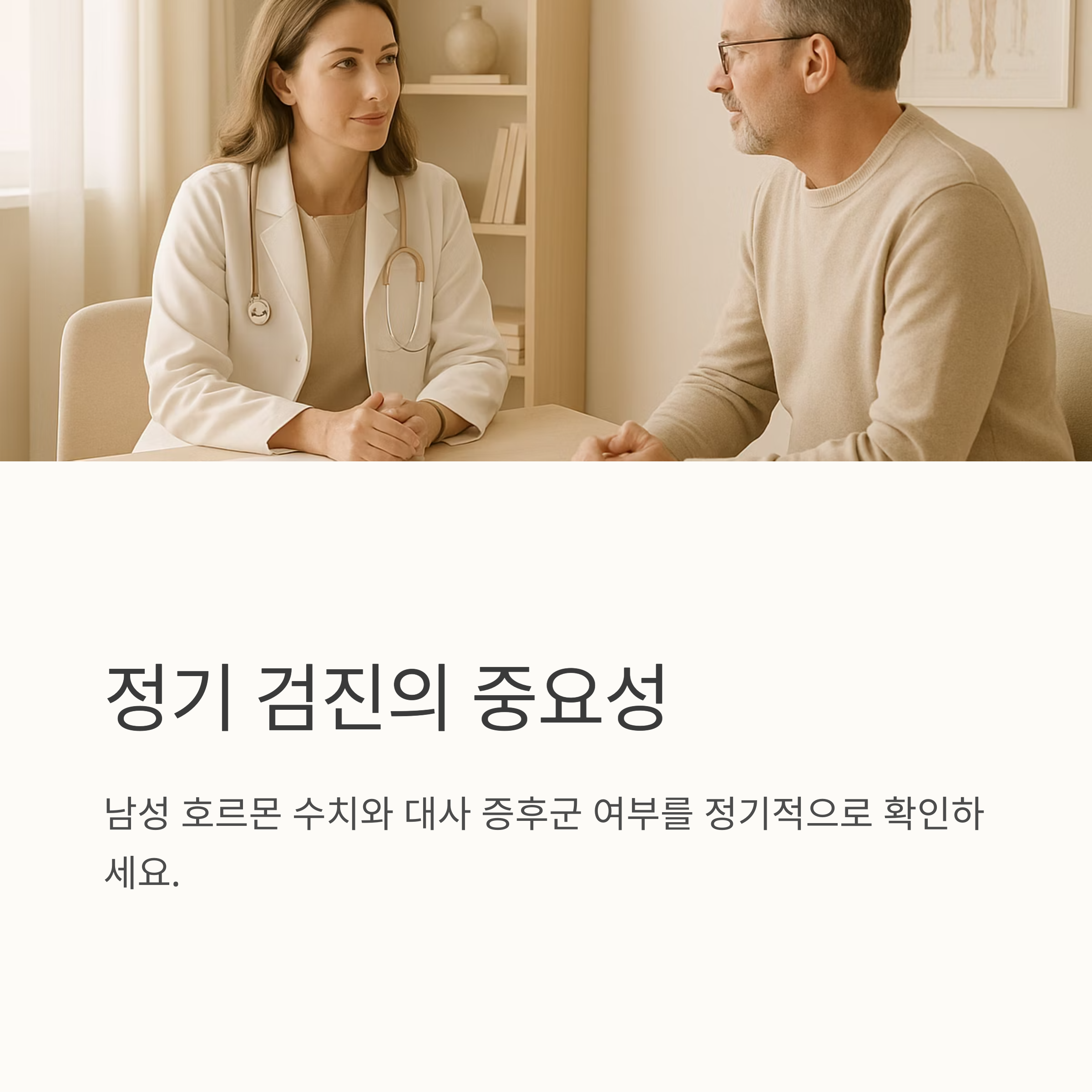 테스토스테론은 수면 중에 생성되니까 숙면을 취하는 것이 중요하죠. 스트레스 관리도 빼놓을 수 없어요. 명상이나 산책, 음악 감상 등으로 스트레스를 관리하면 도움이 되고요. 그리고 정기적인 건강 검진은 필수예요. 남성 호르몬 수치와 대사 증후군 여부를 확인하는 정기검진을 통해 건강 상태를 꾸준히 체크해야 해요.