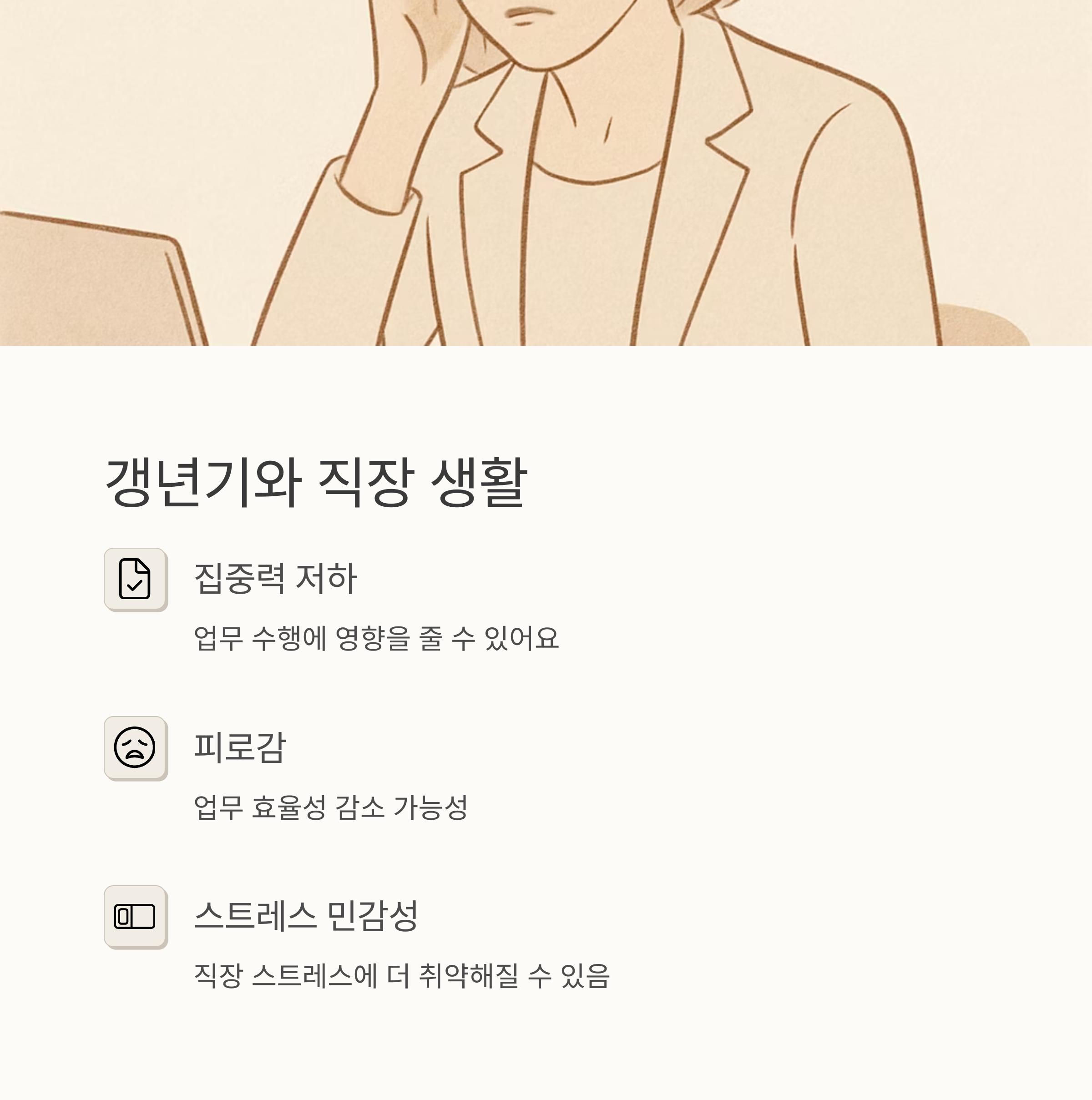 근육량이 줄고, 배에 살이 찌면서 체형이 변하는 것도 갱년기의 신호일 수 있어요. 여기에 기분이 자주 변하고, 집중이 안 되고, 잠도 설치고, 심지어 심장이 빨리 뛰는 증상까지 나타나면 힘들겠죠. 하지만 절대 포기하지 마세요. 이런 증상들은 관리를 통해 충분히 개선할 수 있답니다. 가장 중요한 것은 이러한 증상들을 가볍게 여기지 않고, 내 몸의 변화에 귀 기울이는 거예요.