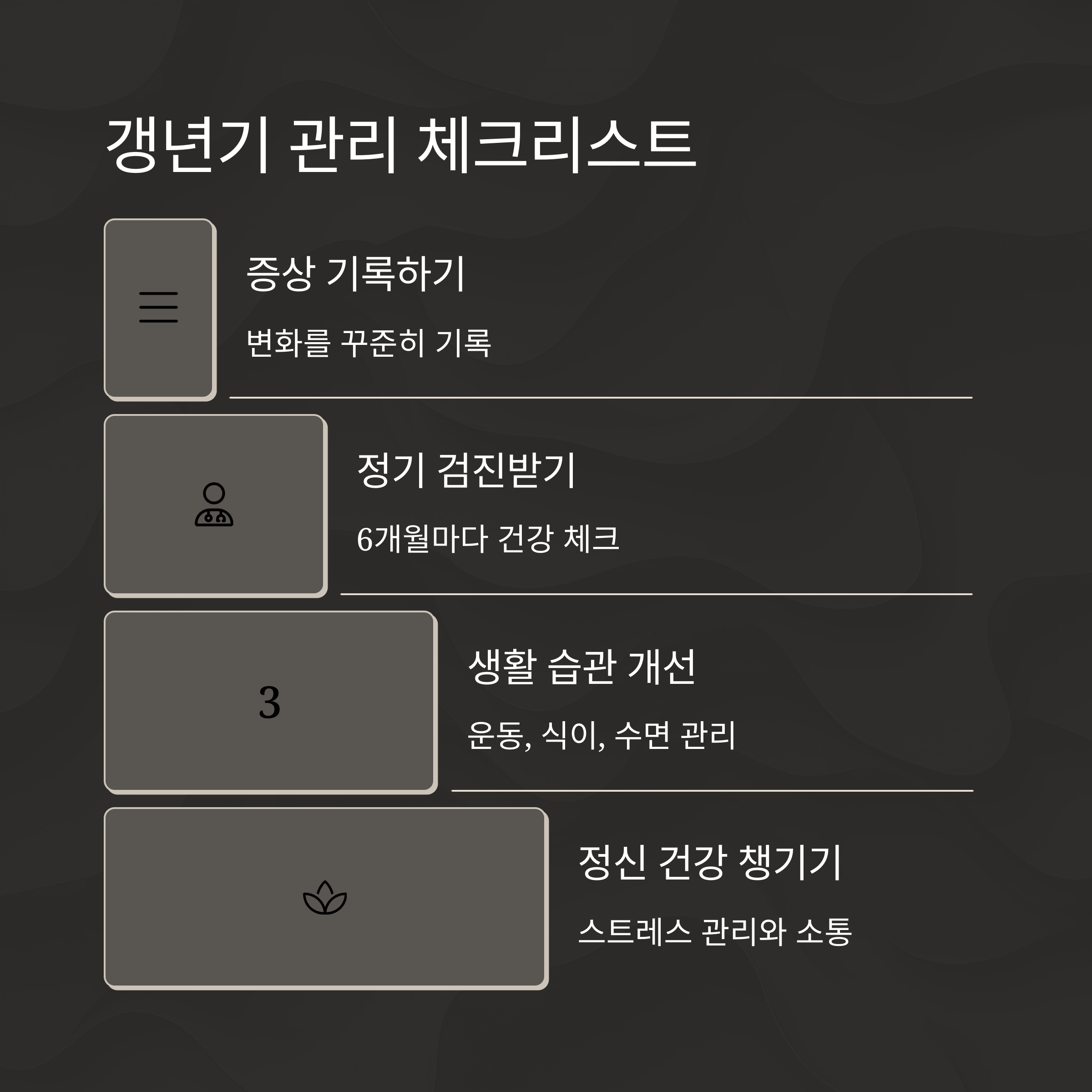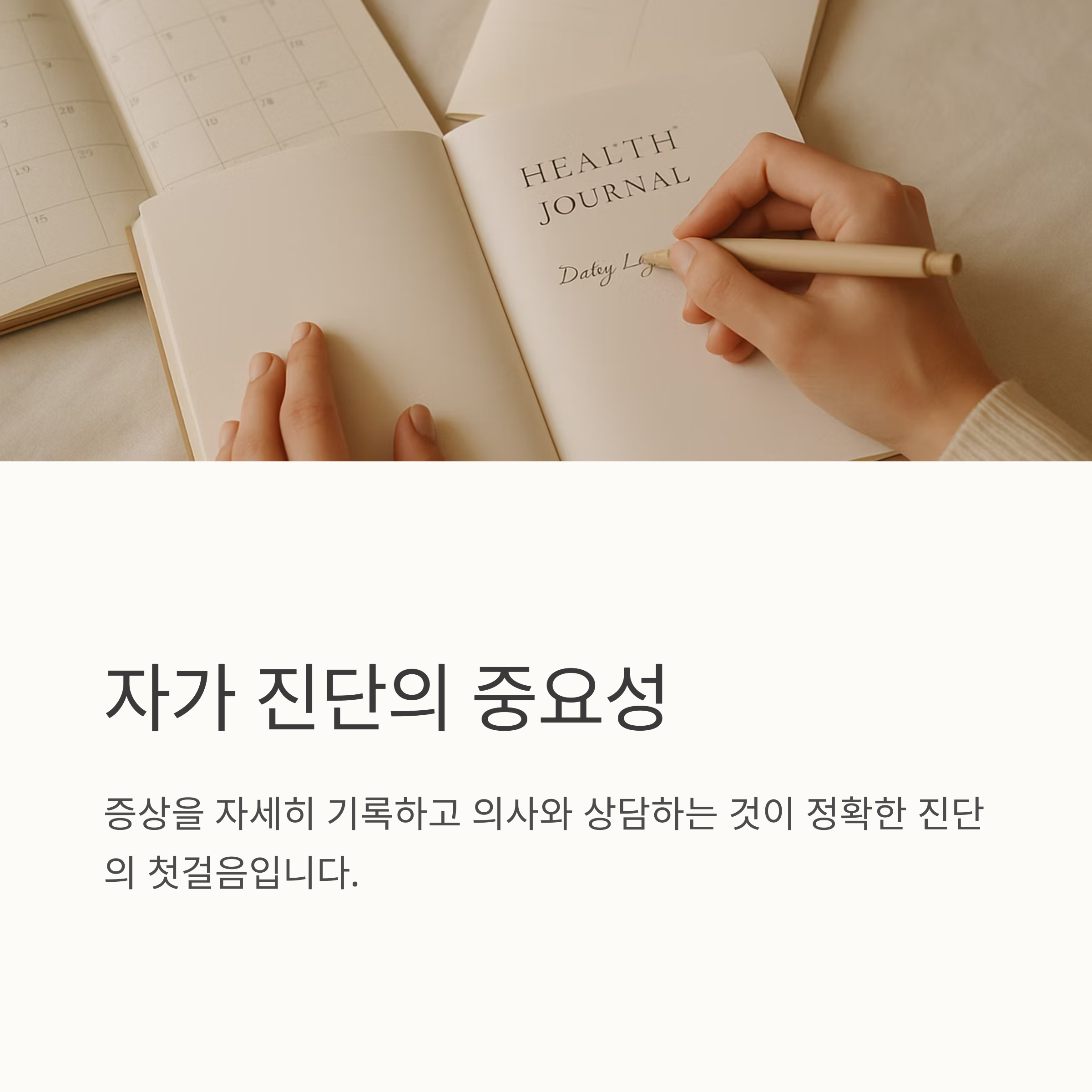 일상생활에서 조금만 신경 쓰면 쉽게 증상을 확인하고 관리할 수 있습니다. 자신의 증상을 자세히 기록해두고 병원에서 의사와 상의하는 것도 도움이 될 거예요. 내 몸의 변화를 이해하고, 적절한 대처법을 찾아나가는 것. 그게 바로 갱년기를 건강하게 극복하는 첫걸음입니다.