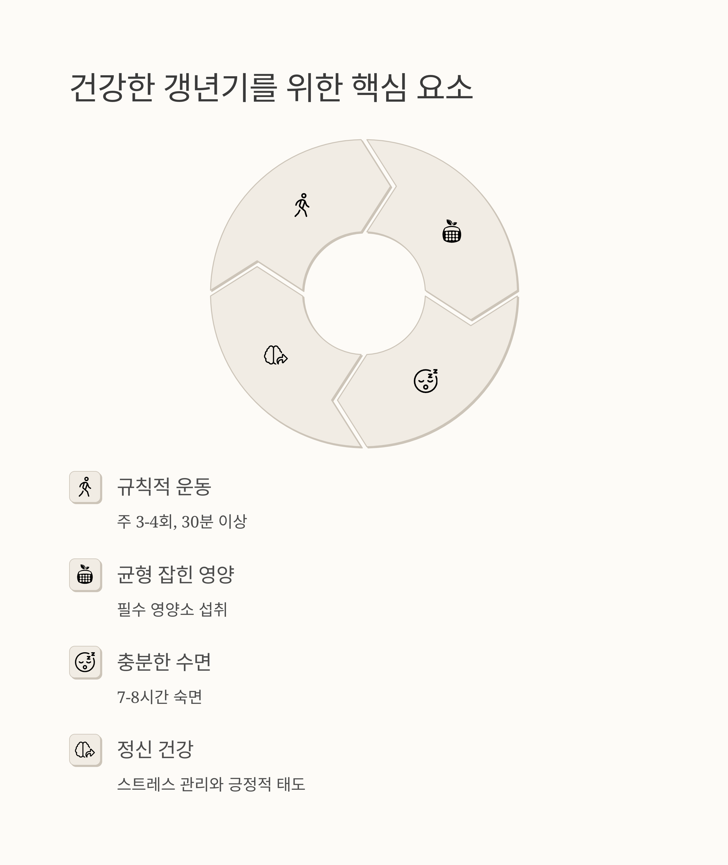 근육량이 줄고, 배에 살이 찌면서 체형이 변하는 것도 갱년기의 신호일 수 있어요. 여기에 기분이 자주 변하고, 집중이 안 되고, 잠도 설치고, 심지어 심장이 빨리 뛰는 증상까지 나타나면 힘들겠죠. 하지만 절대 포기하지 마세요. 이런 증상들은 관리를 통해 충분히 개선할 수 있답니다. 가장 중요한 것은 이러한 증상들을 가볍게 여기지 않고, 내 몸의 변화에 귀 기울이는 거예요.