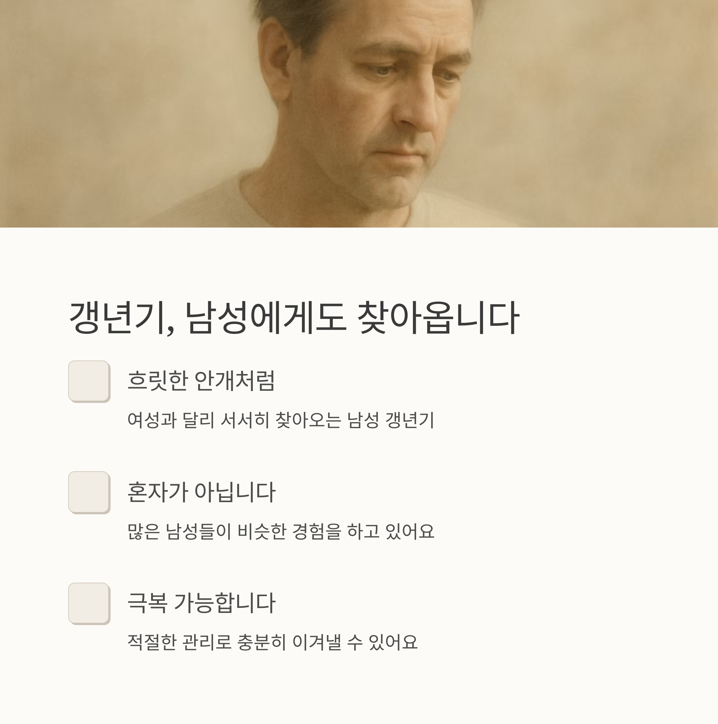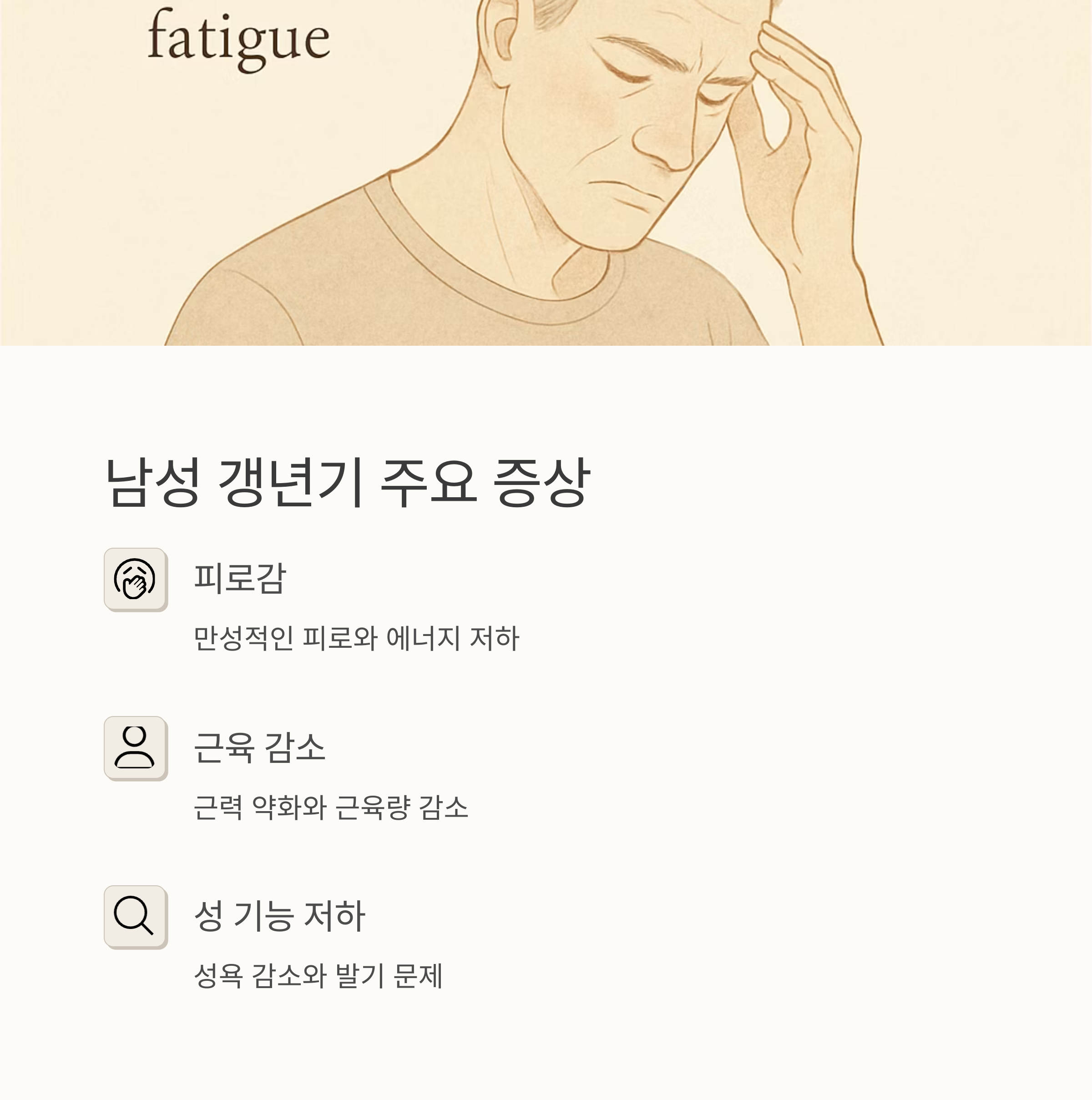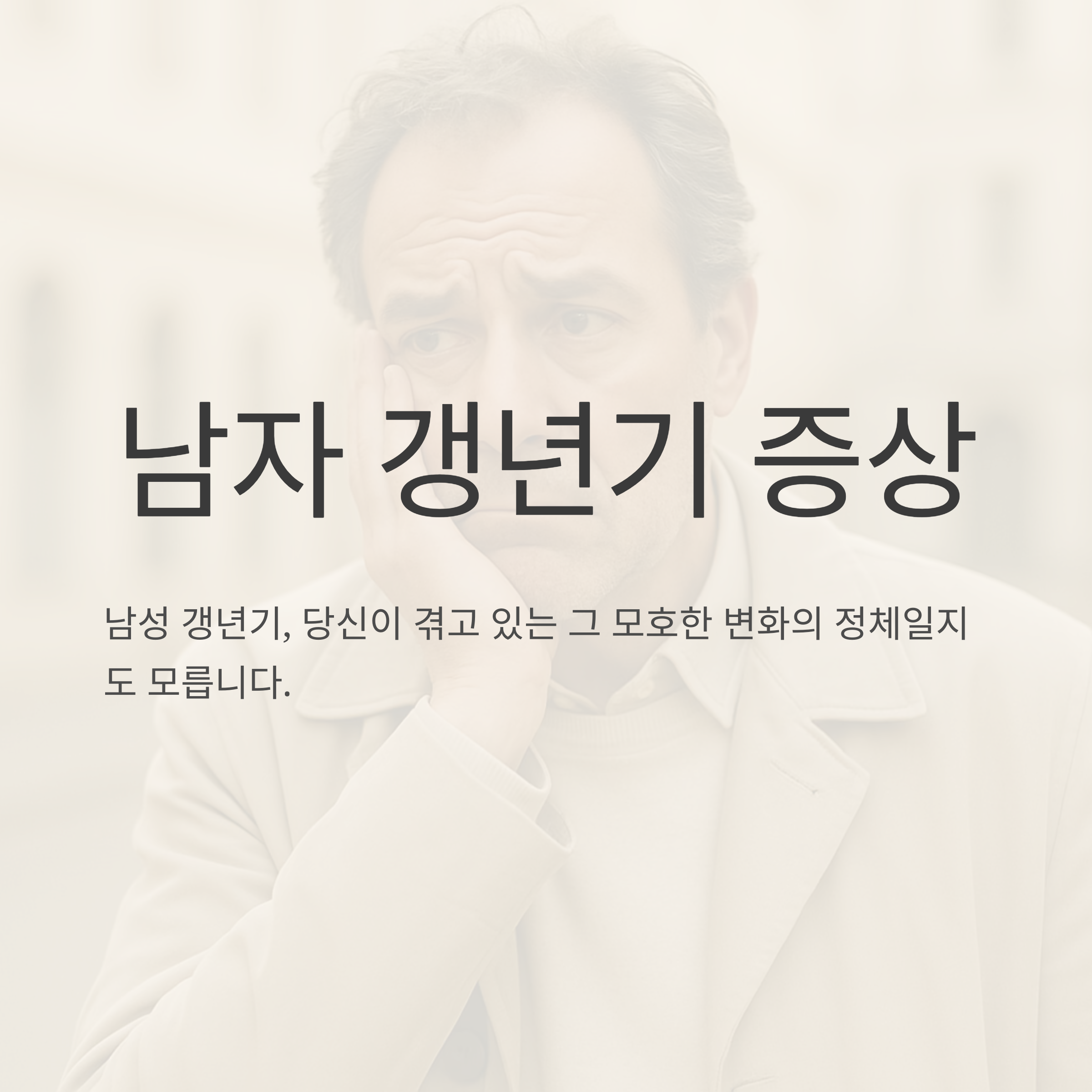 갱년기는 흔히 여자분들만 겪는 거라고 생각하시죠? 맞아요, 여성 갱년기는 폐경이라는 확실한 시점이 있어서 쉽게 알아차릴 수 있지만, 남자 갱년기는 조금 달라요. 흐릿한 안개처럼, 어느 순간부터 몸이 예전 같지 않다는 느낌이 들죠. 피로가 몰려오고, 잠도 잘 안 오고, 툭하면 기분이 왔다 갔다 하고.. 아, 이게 갱년기 증상인가? 싶으실 거예요.