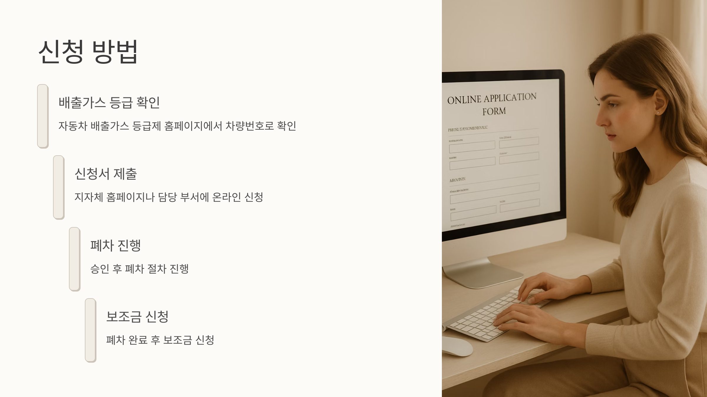그다음은 내가 사는 지자체 홈페이지나 담당 부서에 조기폐차 신청서를 제출해야 해요. 대부분 온라인으로도 신청 가능하답니다. 서류 제출 후 폐차 절차를 진행하고, 마지막으로 보조금 신청을 하면 끝! 생각보다 간단하죠? 하지만 예산이 소진되면 조기 마감될 수도 있으니, 되도록 빨리 신청하는 것이 좋아요.