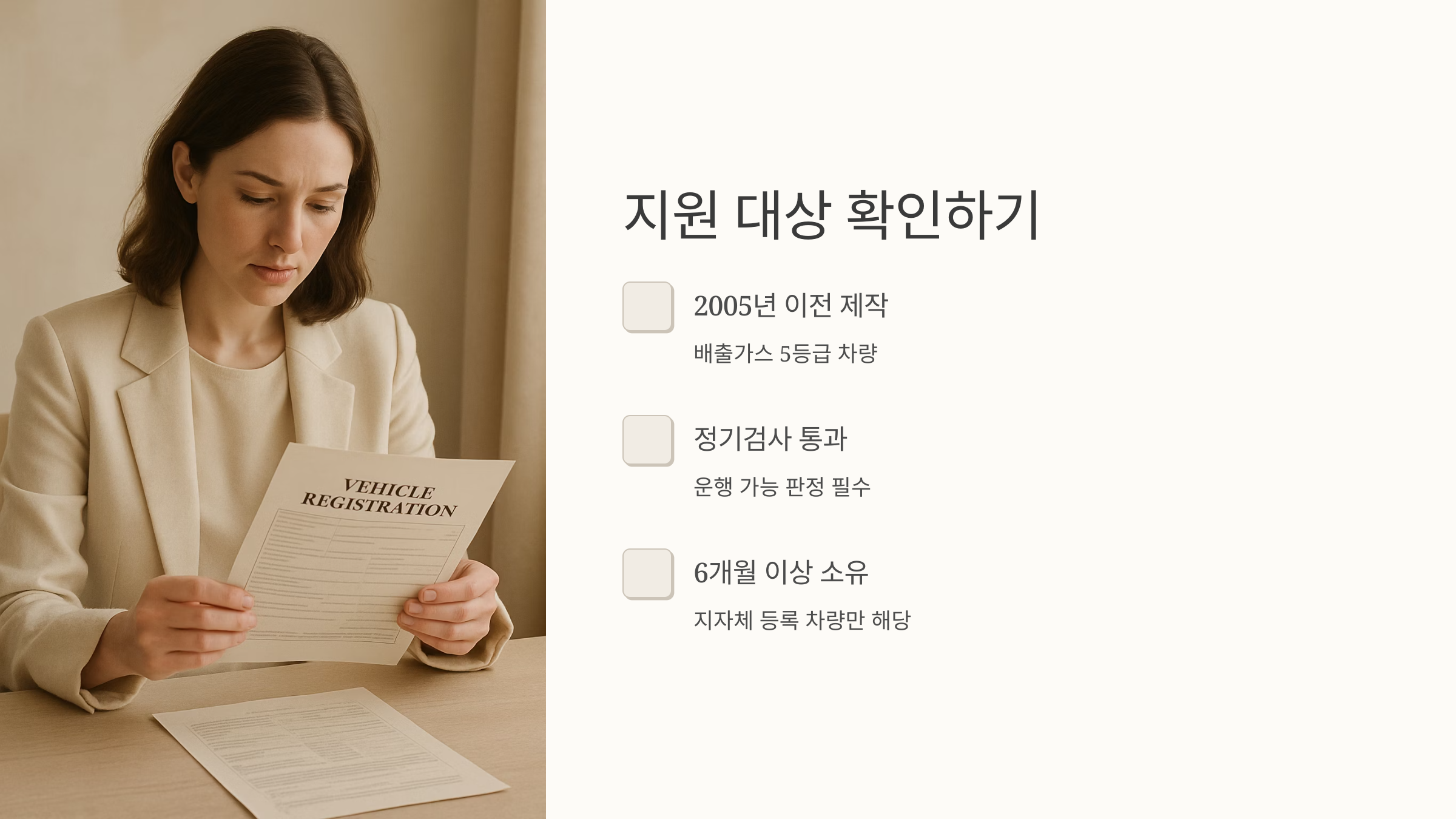 그리고 정기 검사에서 운행 가능 판정을 받았어야 하며, 지자체에 등록된 차량으로 6개월 이상 소유하고 있어야 지원 대상이 된답니다. 내 차가 지원 대상인지 꼼꼼하게 확인해보세요! 혹시라도 조건이 안 맞더라도 너무 실망하지 마세요. 아래에서 다른 혜택들도 함께 알아볼 거니까요!