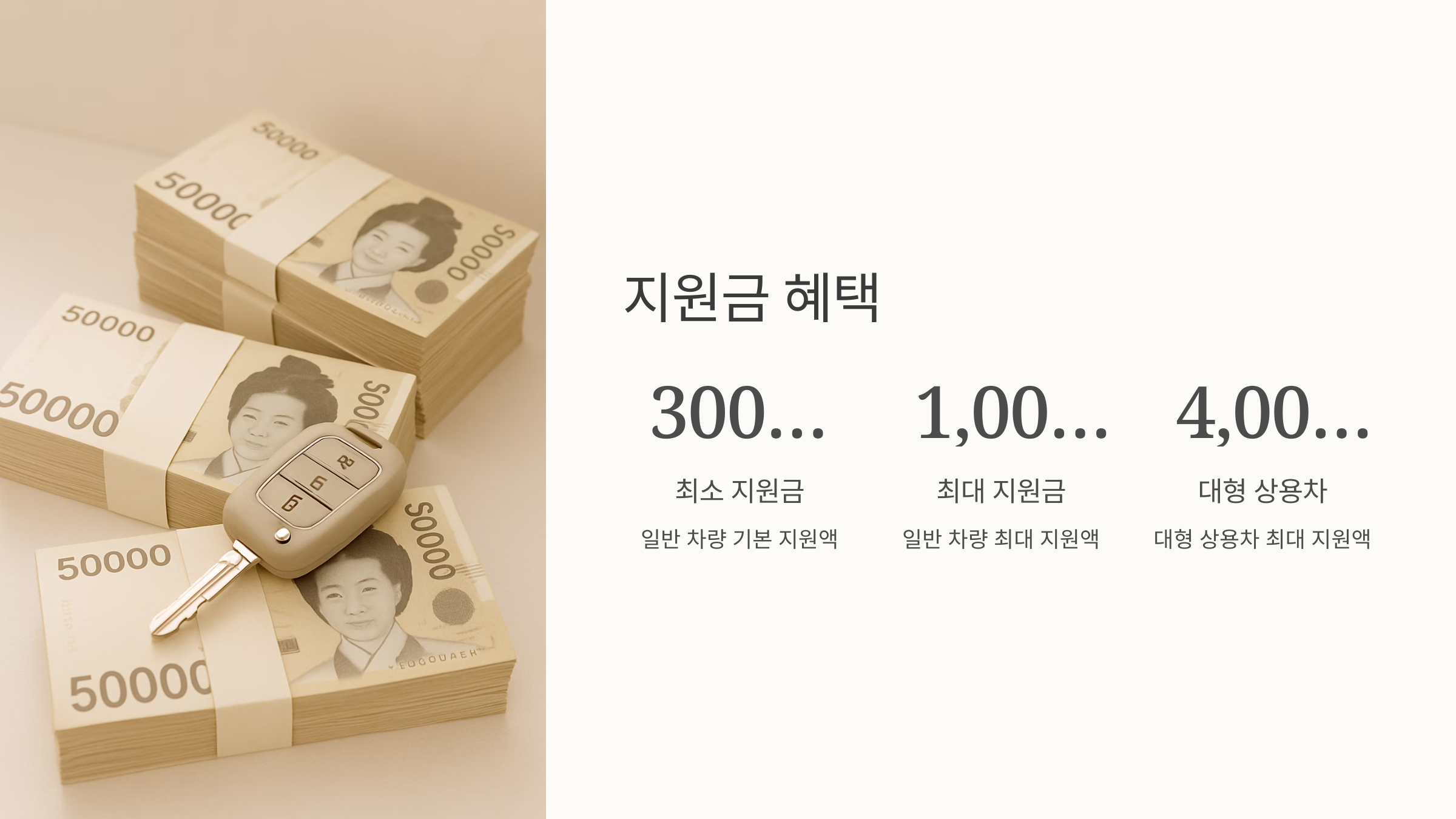일반 차량은 300만 원부터 최대 1,000만 원까지, 대형 상용차는 4,000만 원을 넘길 수도 있다고 하니 기대가 되시죠? 하지만 아무 경유차나 되는 건 아니에요. 2005년 이전에 만들어진 경유차여야 하고, 배출가스 등급이 5등급이어야 해요.