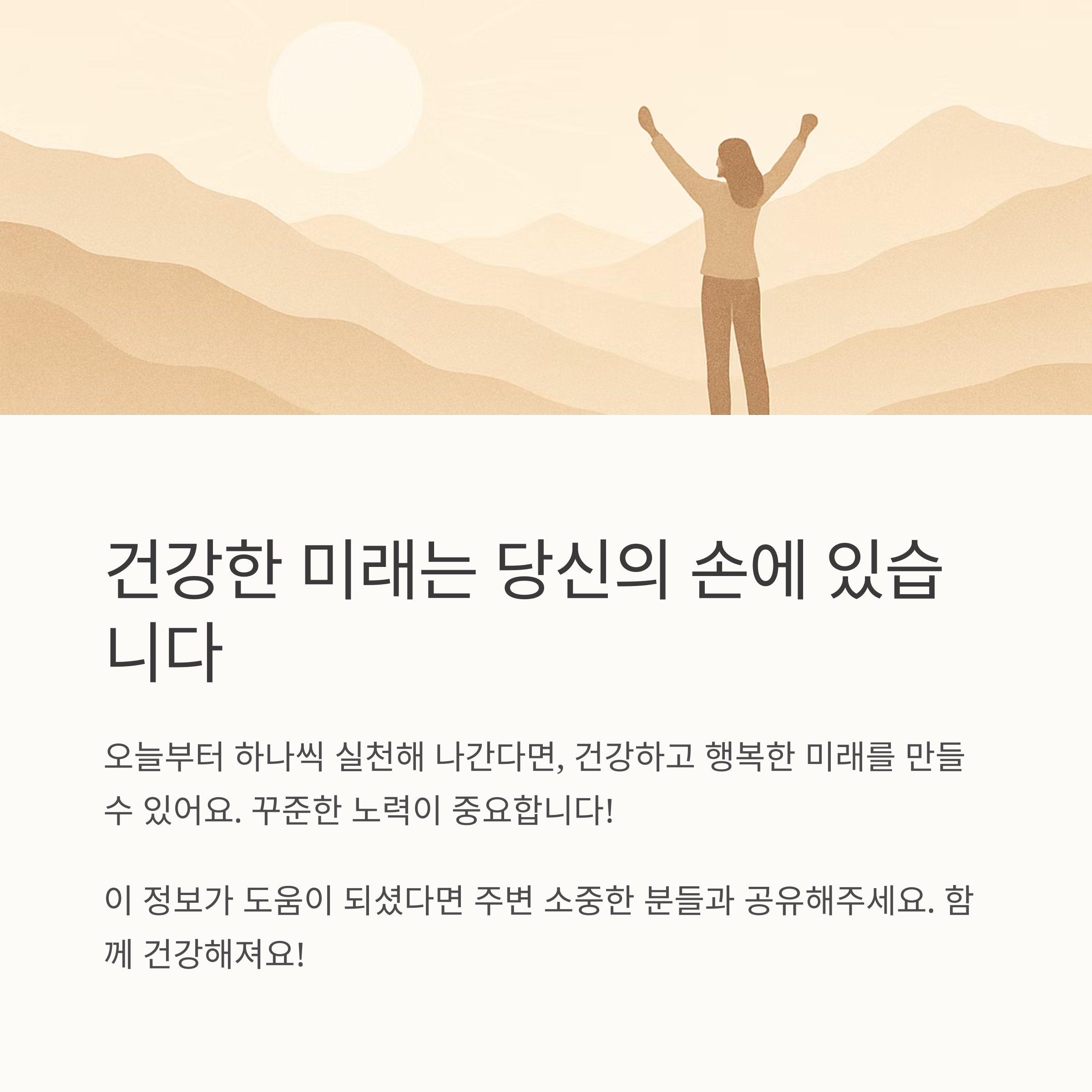 뇌졸중 예방법은 꾸준한 노력과 관심이 필요하지만, 절대 불가능한 일이 아니에요. 오늘부터 하나씩 실천해 나간다면, 분명 건강하고 행복한 미래를 만들 수 있을 거예요. 가장 중요한 것은 자신에게 맞는 방법을 찾는 것과 꾸준히 실천하는 것입니다. 건강한 삶을 향한 여러분의 여정을 항상 응원합니다. 자신의 건강을 책임지는 것은 바로 여러분 자신이에요! 조금씩, 천천히, 하지만 꾸준히 노력해서 건강한 삶을 만들어가세요. 여러분의 건강한 미래를 응원합니다!
