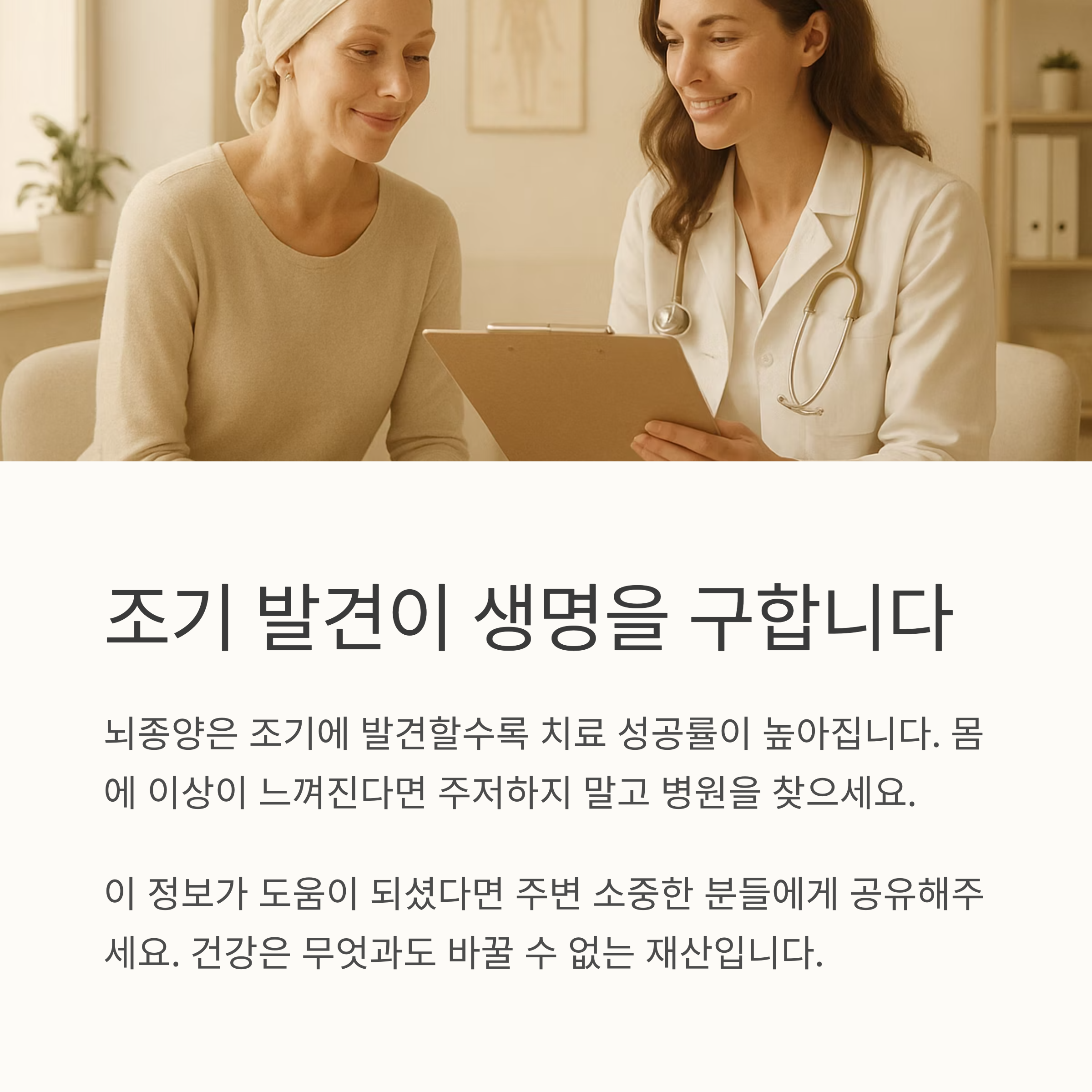 뇌종양은 조기에 발견할수록 치료 성공률이 높아요. 이 글을 통해 뇌종양의 증상과 진단 과정을 이해하고, 자신의 몸에 조금이라도 이상이 느껴진다면 주저하지 말고 병원을 찾아 정확한 진단을 받으세요. 건강은 무엇과도 바꿀 수 없는 소중한 재산입니다. 여러분의 건강을 위해 항상 응원하겠습니다.