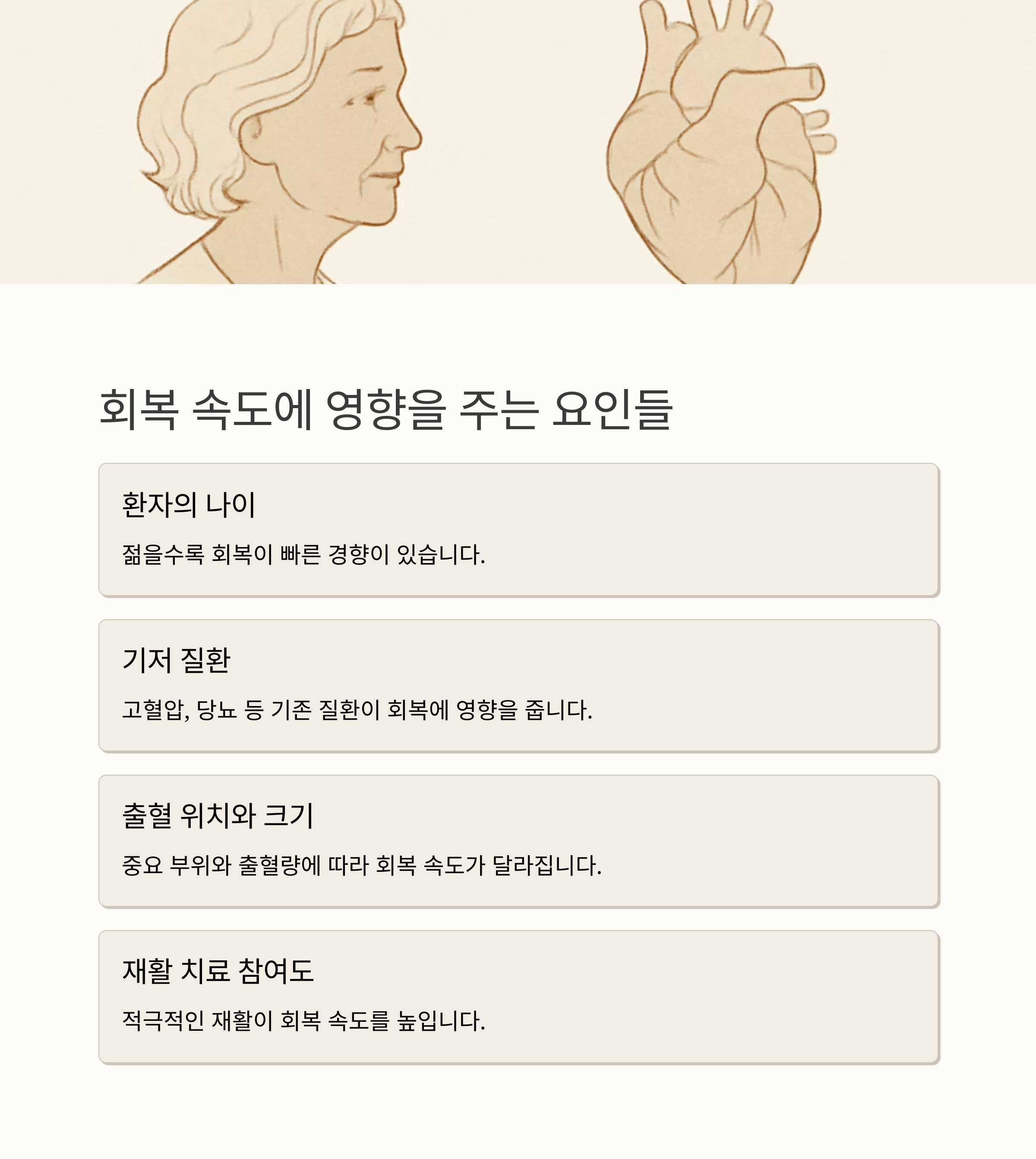 그리고 3-6개월 정도면 가벼운 일상생활이 가능할 정도로 회복될 수 있습니다. 물론 이것은 경증의 경우이며, 환자의 나이, 기저 질환, 출혈 위치, 수술 시기 등에 따라 회복 속도와 예후는 크게 달라질 수 있습니다. 회복 과정은 마라톤과 같아요. 단기간에 끝나는 것이 아니라, 꾸준한 노력과 인내심을 필요로 합니다.