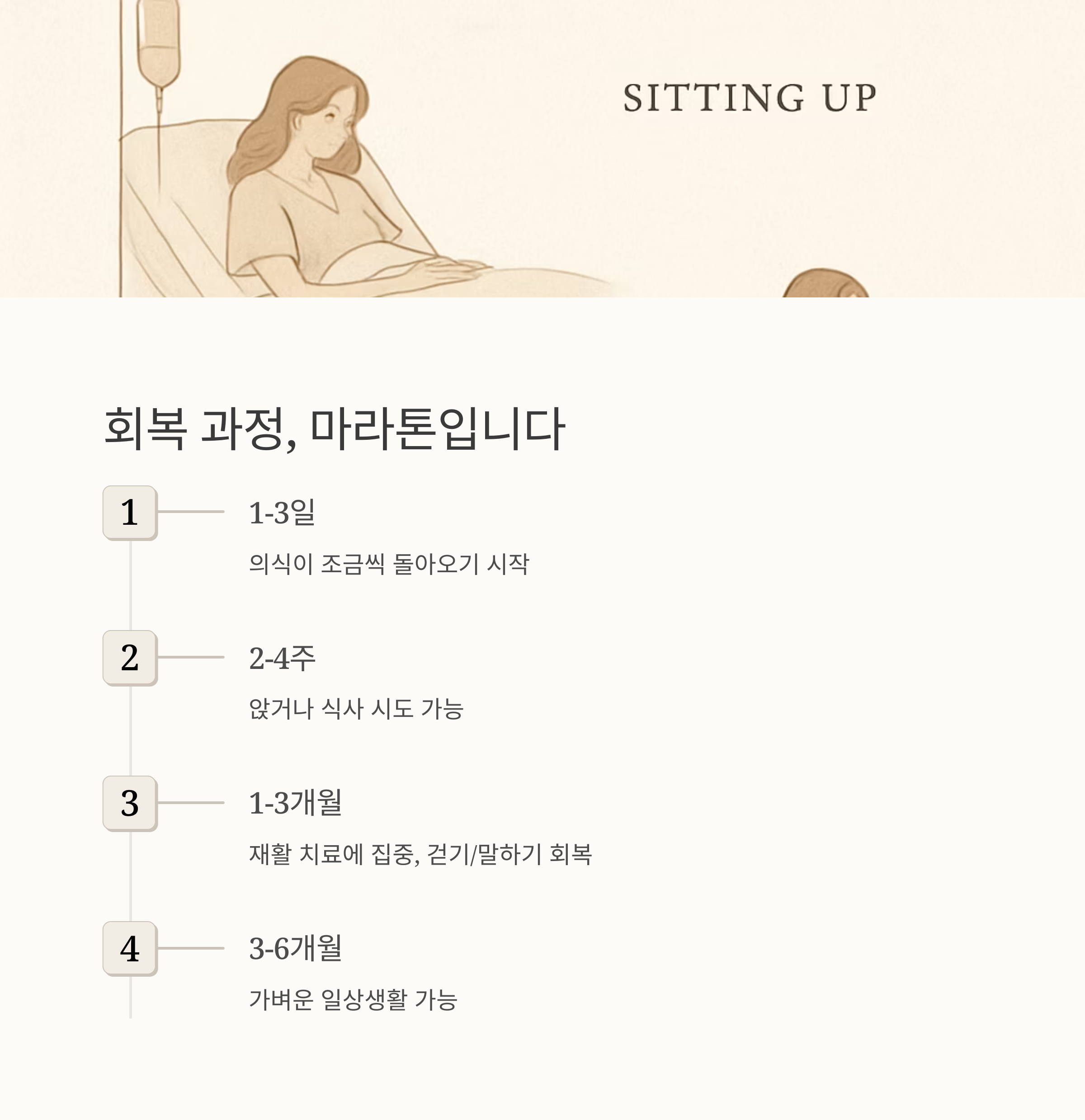 수술 후 회복 기간은 개인차가 크지만, 대략적인 과정을 알려드릴게요. 수술 후 1-3일 정도면 의식이 조금씩 돌아오기 시작하고, 2-4주 정도면 앉거나 식사를 시도할 수 있게 됩니다. 1-3개월 정도는 재활 치료에 집중하여 걷기, 말하기 등의 기능을 회복하는 데 힘쓰게 되죠.