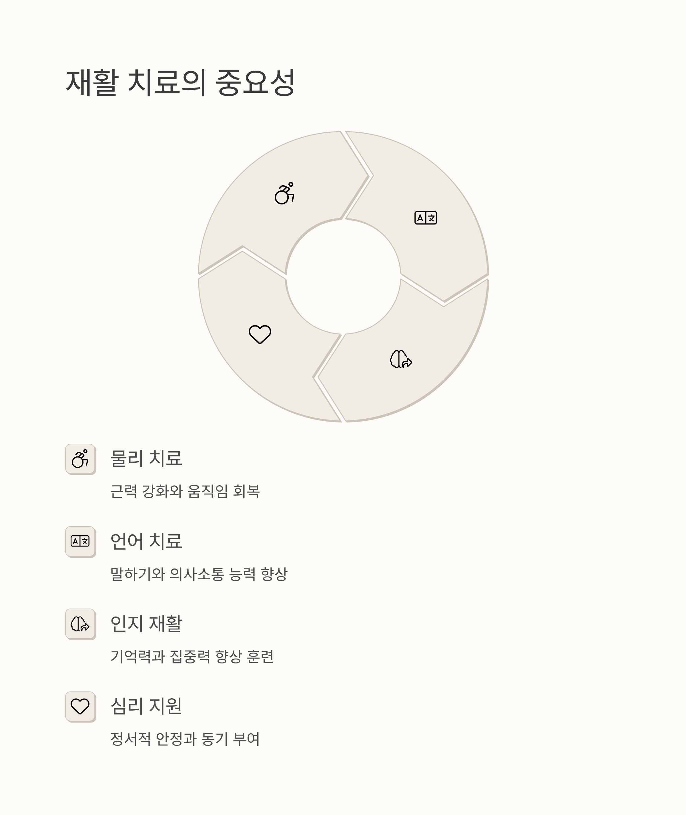 환자와 보호자 모두 긍정적인 마음을 유지하고, 꾸준히 재활에 매달린다면 회복의 속도를 높이고 삶의 질을 개선할 수 있을 거예요. 회복의 여정을 함께 걷는 사람들이 있다는 것을 기억하고, 힘든 시간을 함께 이겨내도록 하세요.