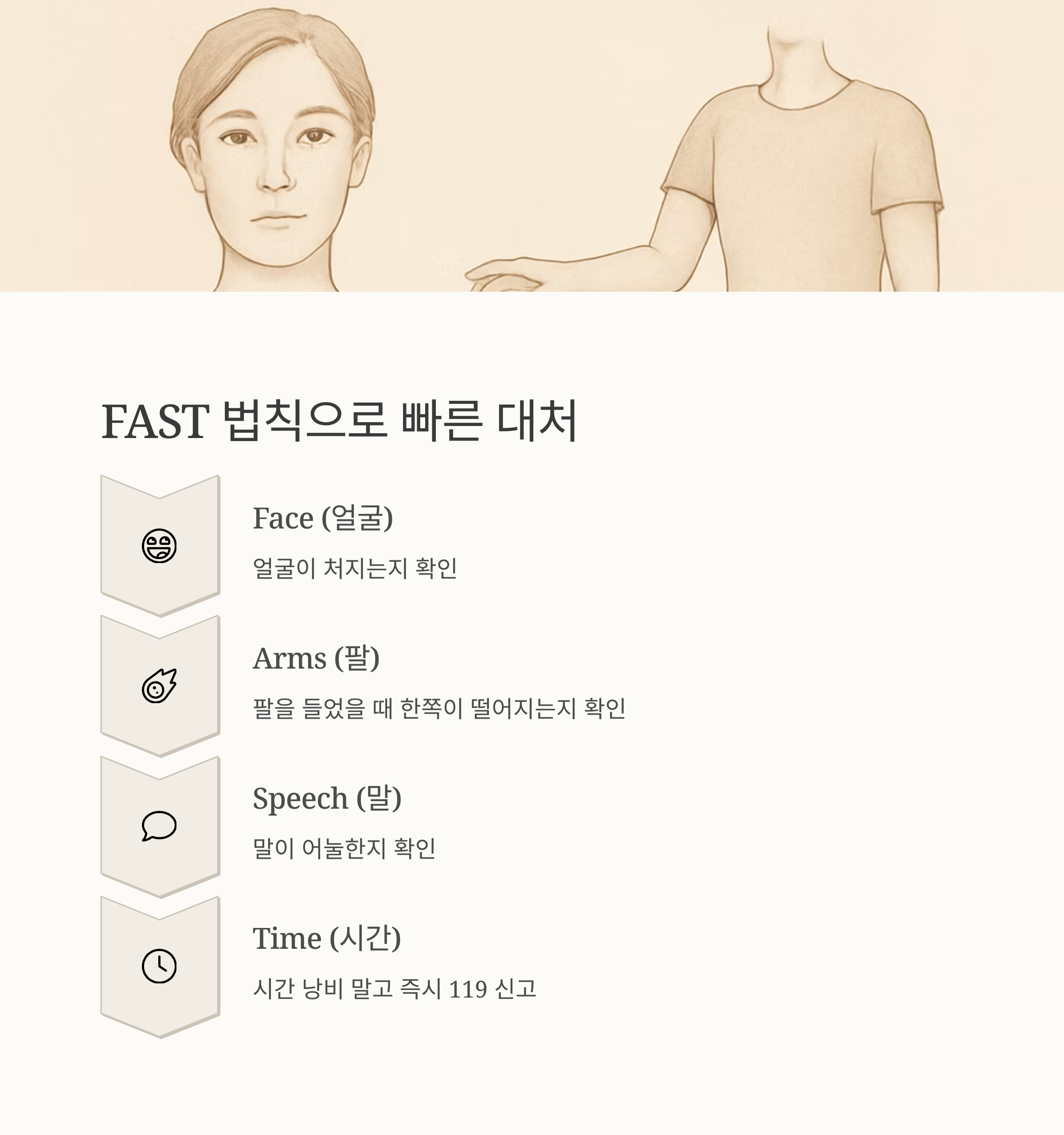 그리고 FAST 법칙을 기억하면 도움이 돼요. 얼굴(Face)이 처지거나, 팔(Arms)을 들었을 때 한쪽이 힘없이 떨어지거나, 말(Speech)이 어눌해지거나 이해하기 어렵거나, 시간(Time)을 낭비하지 말고 바로 119에 신고해야 해요.