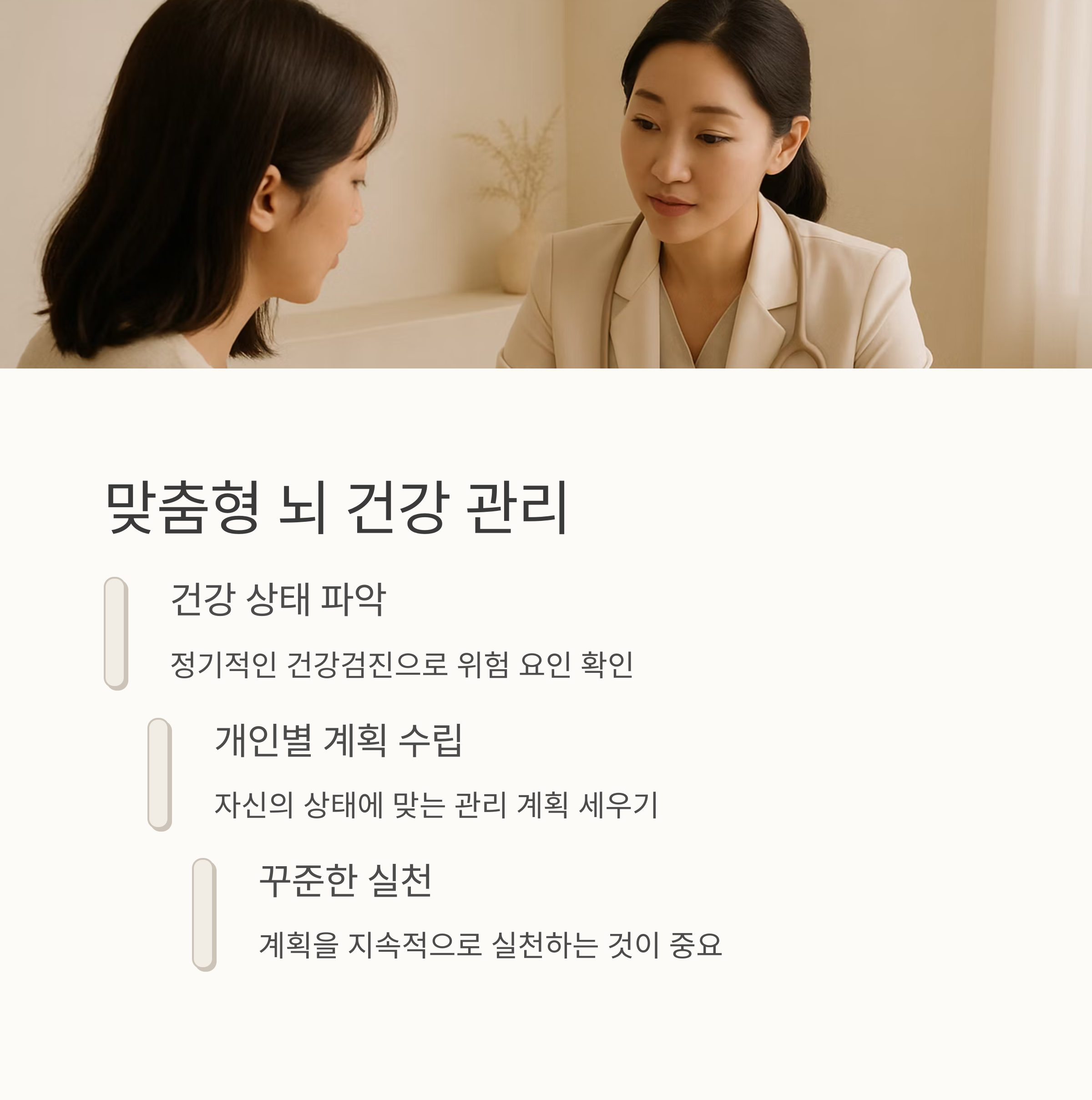 뇌 건강 관리는 단순히 병원에 가서 검진을 받는 것만으로 끝나지 않아요. 개인의 건강 상태와 생활 습관에 맞는 맞춤형 관리 계획을 세우는 것이 중요합니다. 예를 들어, 고혈압이 있는 분이라면 혈압을 꾸준히 관리하고, 정기적인 검진을 받아야 합니다. 고지혈증이 있는 분이라면 식단 조절과 운동을 통해 콜레스테롤 수치를 관리해야 합니다.