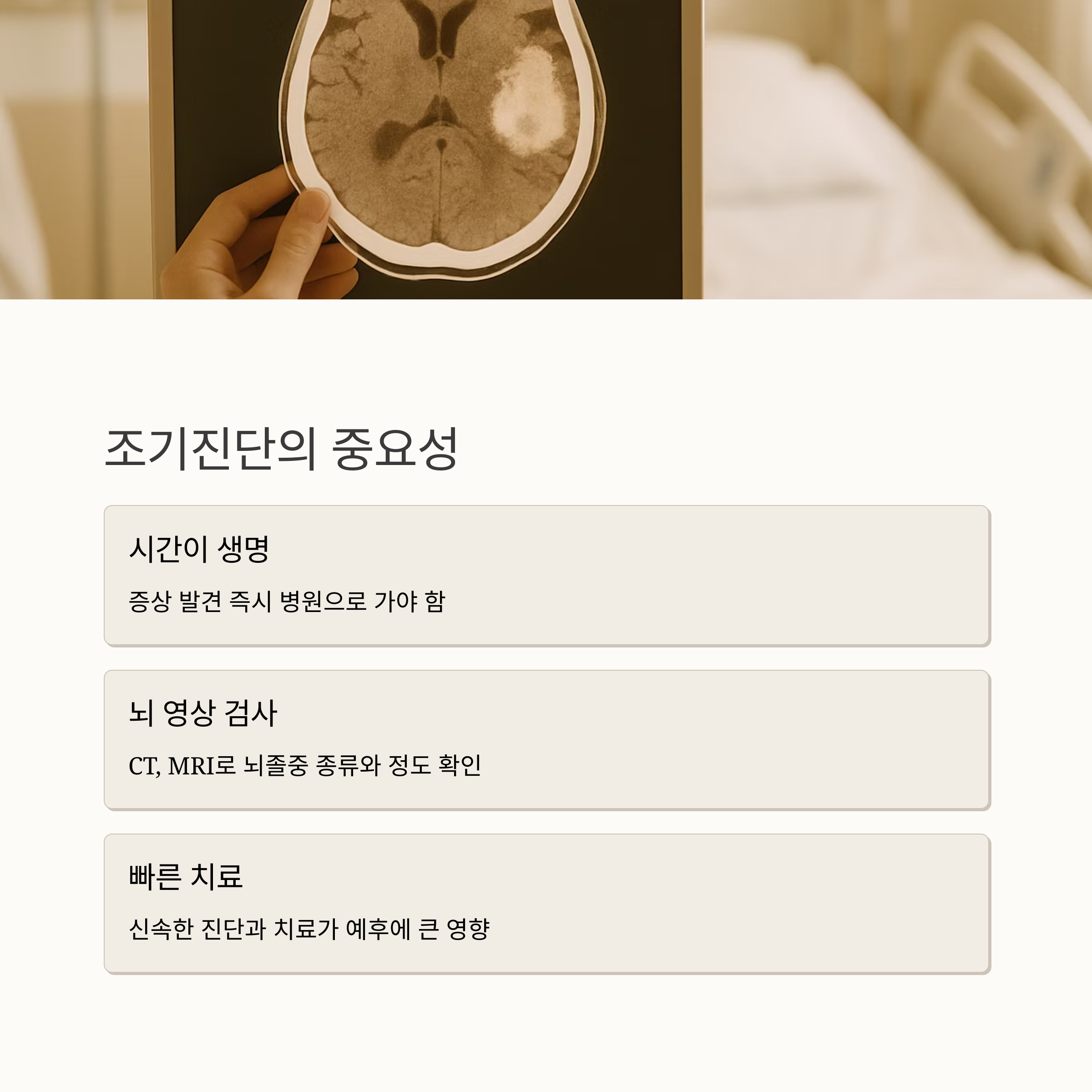 뇌졸중은 시간이 생명인 질병입니다. 증상이 나타나면 시간을 낭비하지 말고 즉시 병원으로 가야 해요. 빠른 진단과 치료가 예후에 큰 영향을 미치기 때문이에요. 병원에서는 뇌 CT 또는 MRI 촬영을 통해 뇌졸중의 종류와 정도를 확인하고, 필요에 따라 혈관 조영술 등의 추가 검사를 진행할 수 있어요.
