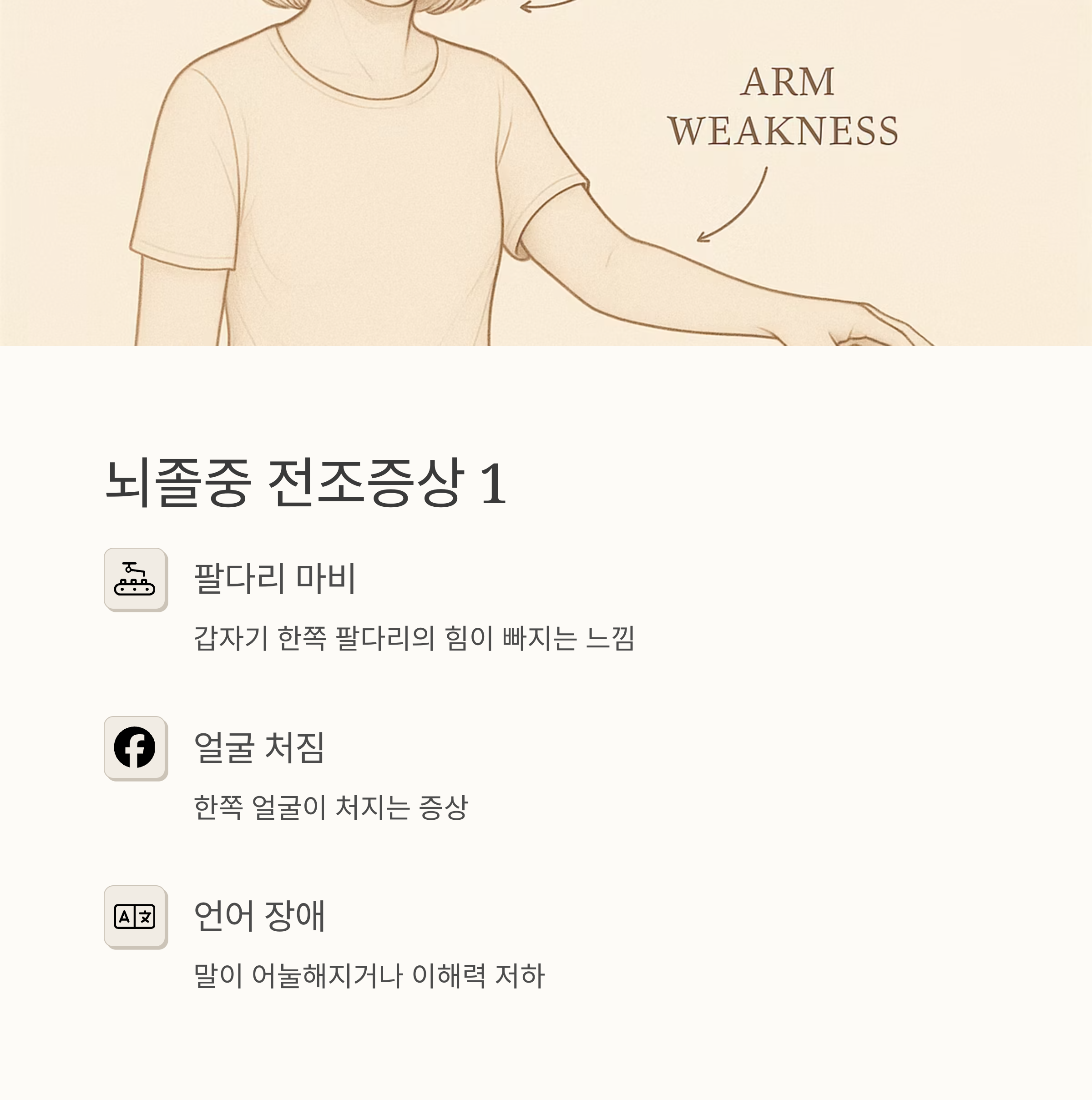 뇌혈관질환 전조증상은 속삭이는 경고와 같아요. 가볍게 여기면 안 되는 중요한 신호입니다. 가장 흔한 증상으로는 갑자기 한쪽 팔다리의 힘이 빠지거나 마비되는 느낌이 있어요. 걷다가 넘어질 뻔하거나, 한쪽 얼굴이 처지는 것처럼 느껴질 수도 있고요. 말이 어눌해지거나, 다른 사람의 말을 이해하기 어려워지는 경우도 있고요.