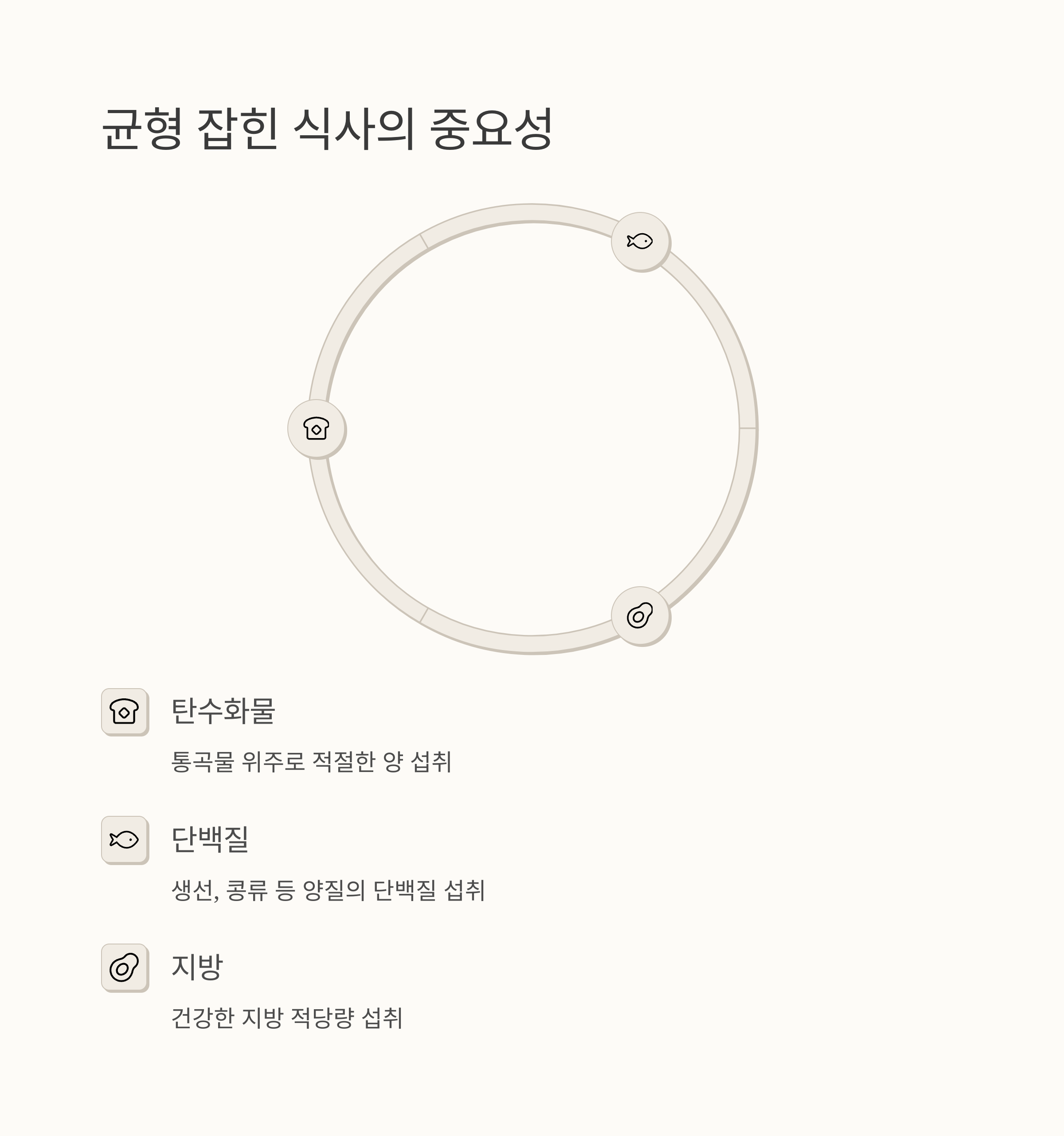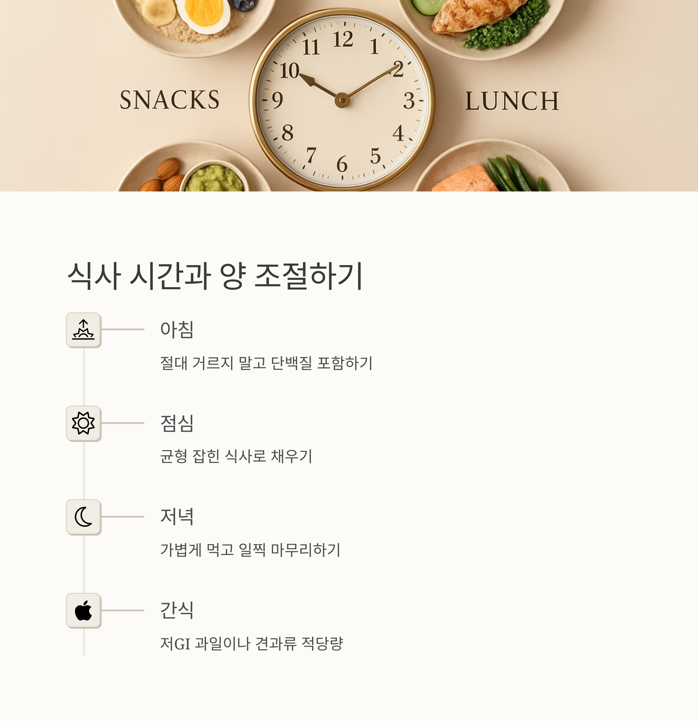 그리고 식사는 꼭! 규칙적으로 하셔야 해요. 아침, 점심, 저녁을 꼬박꼬박 챙기고, 식사 간격이 너무 길어지면 혈당 조절이 어려워지고, 다음 식사 때 과식할 확률도 높아져요. 간식은 혈당을 안정적으로 유지하는 데 도움이 되지만, 저GI 과일이나 견과류처럼 건강한 간식을 적당량 섭취하는 것이 중요합니다. 마지막으로, 탄수화물, 단백질, 지방의 비율을 잘 맞추는 균형 잡힌 당뇨병 식이요법이 필요해요. 너무 어렵게 생각하지 마시고, 천천히 하나씩 실천해 보세요.